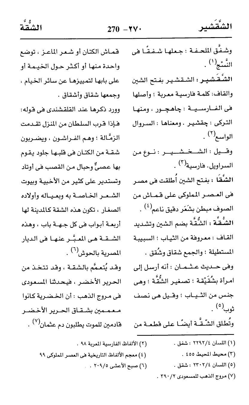 الشَّقَا: بفتح الشين أُطلقت في مصر في العصر المملوكى على قماش من الصوف مبطن بشَعَر دقيق ناعم (¬4).