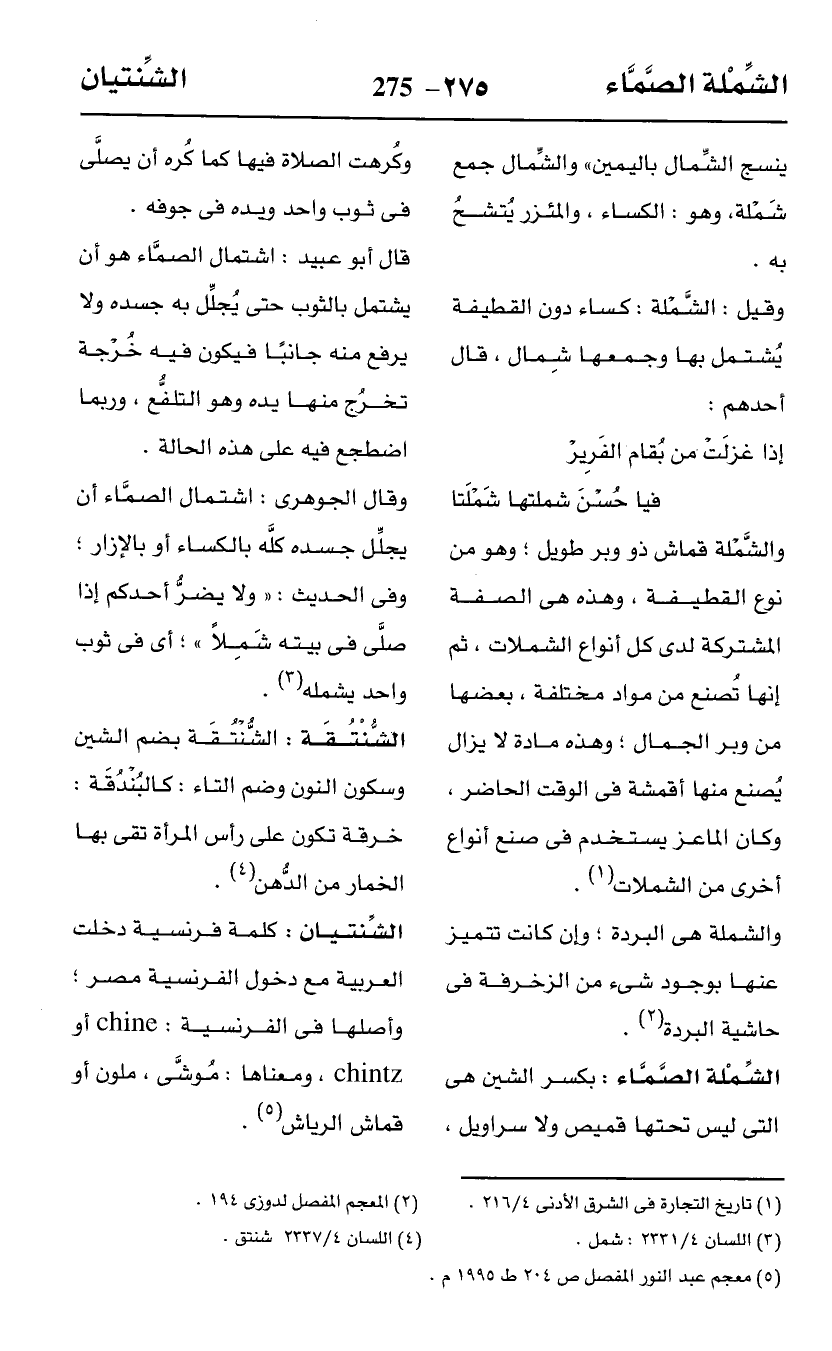 الشِّنتيان: كلمة فرنسية دخلت العربية مع دخول الفرنسية مصر؛ وأصلها في الفرنسية: chine أو chintz، ومعناها: مُوشَّى، ملون أو قماش الرياش (¬5).