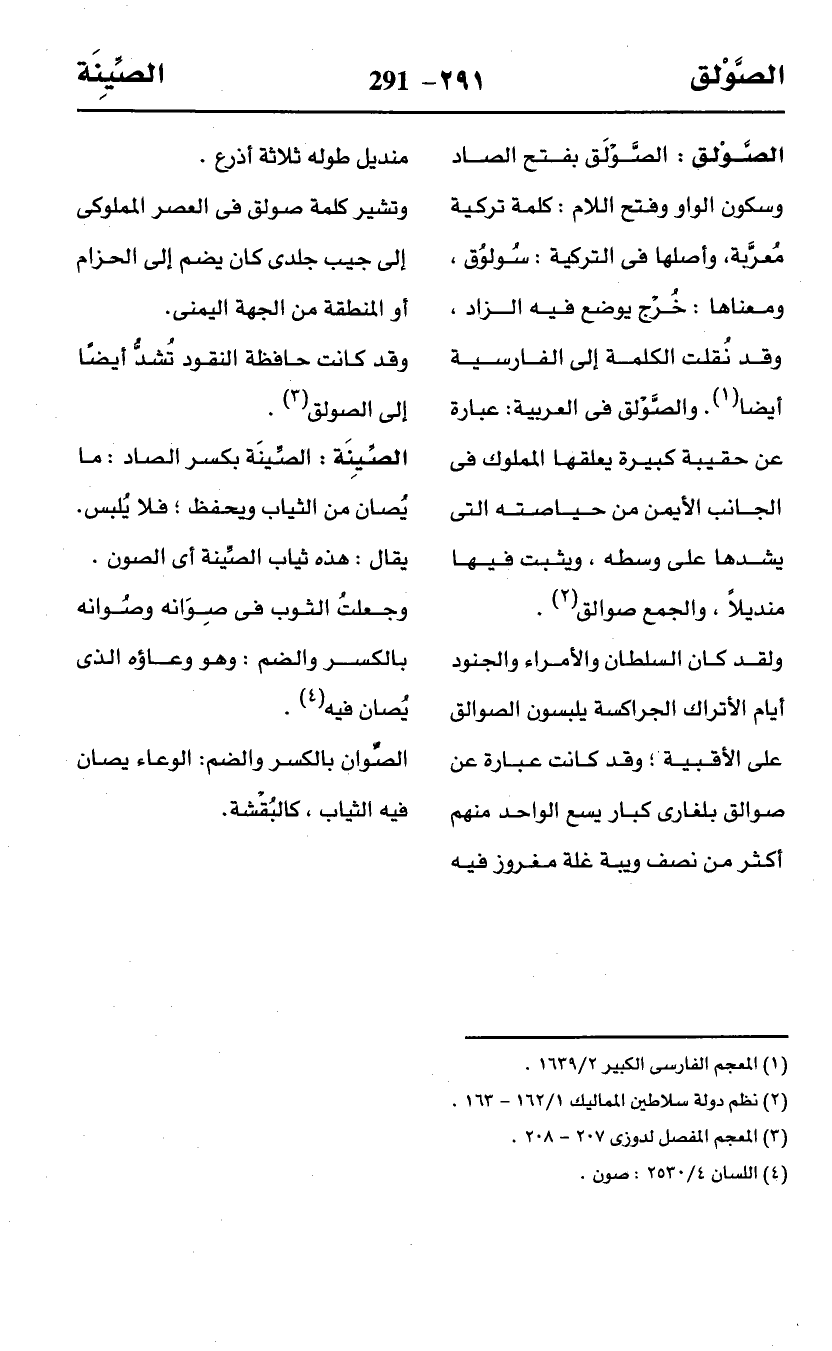 الصَّوْلق: الصَّوْلَق بفتح الصاد وسكون الواو وفتح اللام: كلمة تركية مُعرَّبة، وأصلها في التركية: سُولوُق، ومعناها: خُرْج يوضع فيه الزاد، وقد نُقلت الكلمة إلى الفارسية أيضا (¬1). والصَّوْلق في العربية: عبارة عن حقيبة كبيرة يعلقها المملوك في الجانب الأيمن من حياصته التي يشدها على وسطه، ويثبت فيها منديلًا، والجمع صوالق (¬2).