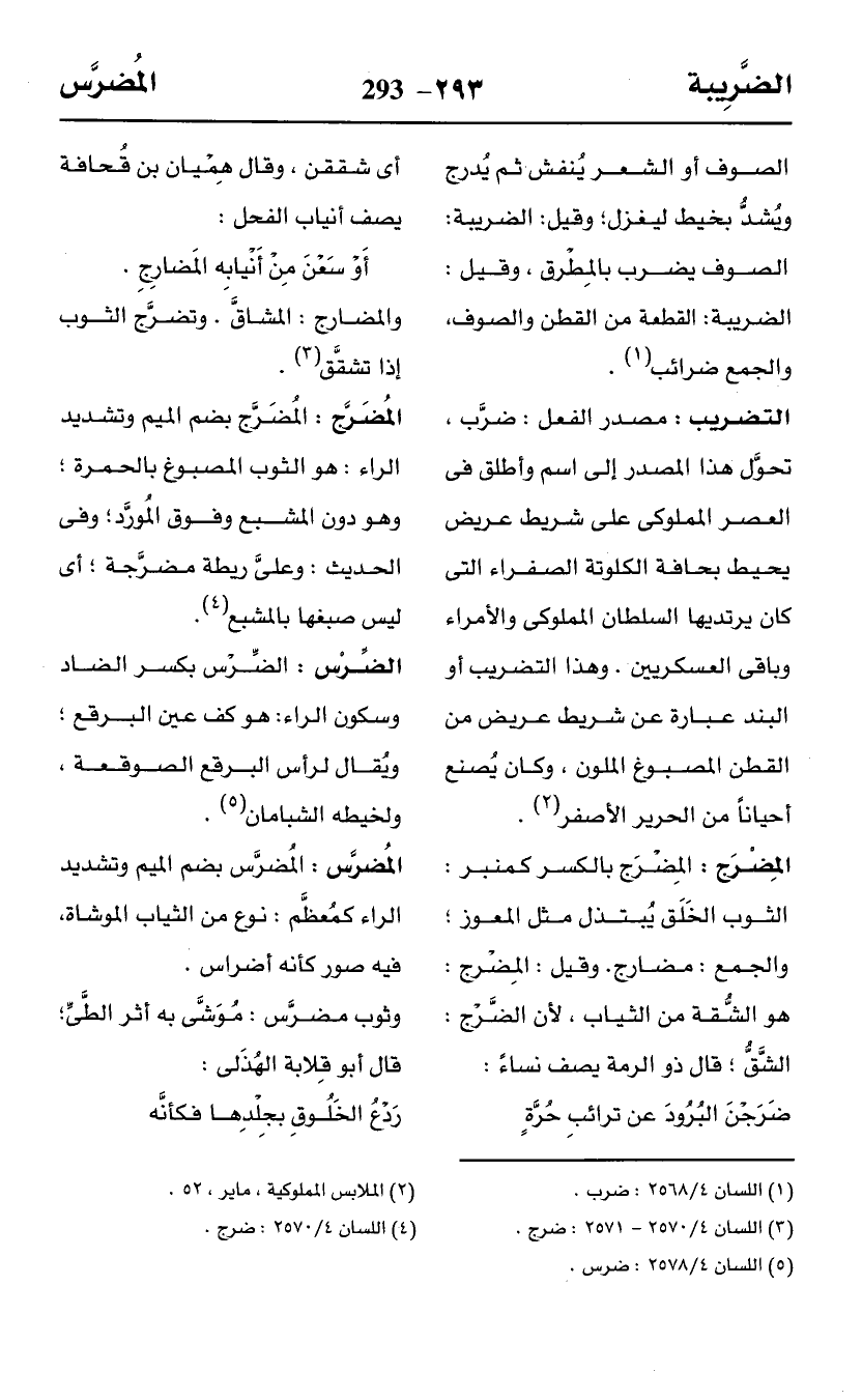 الصوف أو الشعر يُنفش ثم يُدرج ويُشدُّ بخيط ليغزل؛ وقيل: الضريبة: الصوف يضرب بالمِطْرق، وقيل: الضريبة: القطعة من القطن والصوف، والجمع ضرائب (¬1).