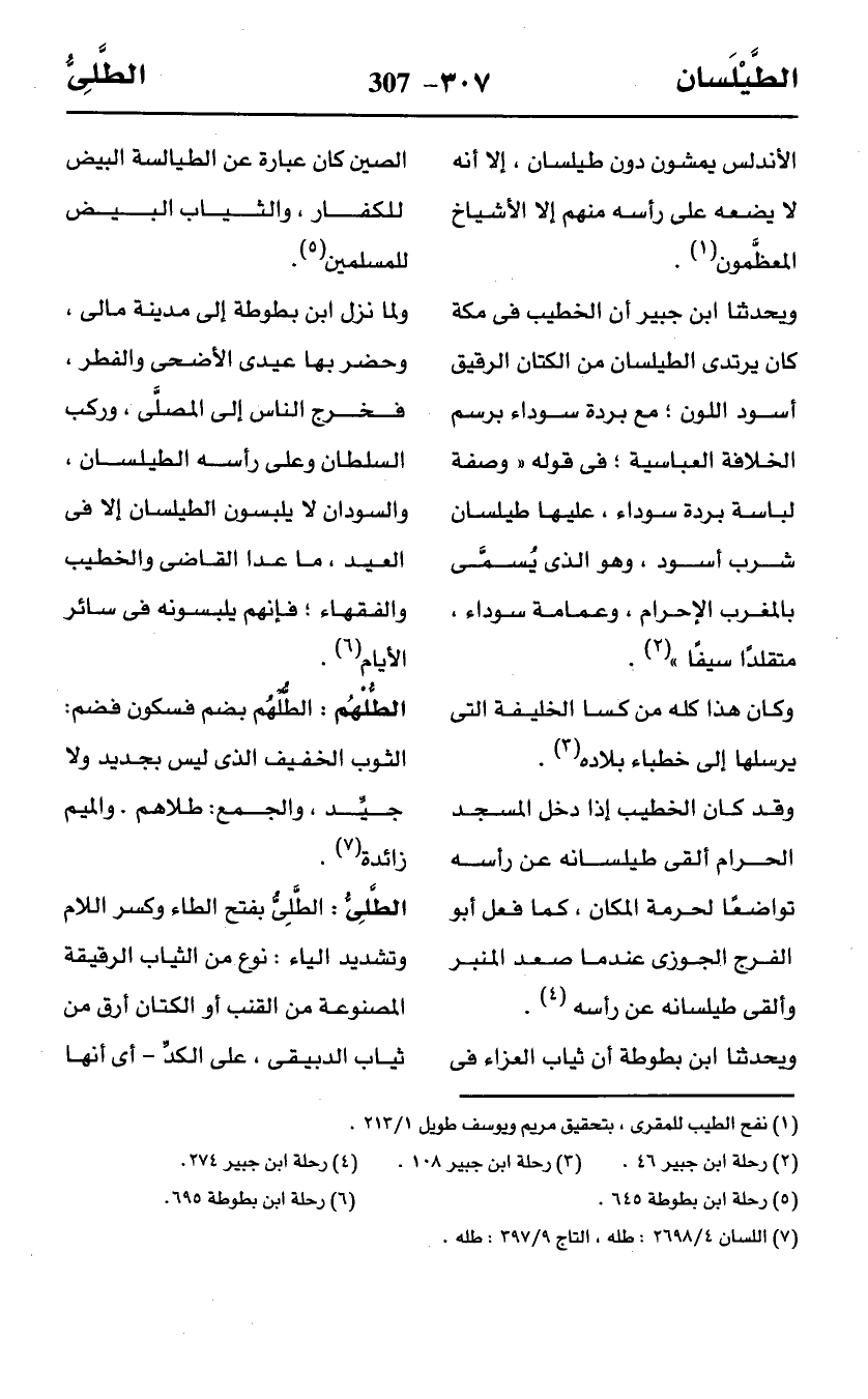 ويحدثنا ابن جبير أن الخطيب في مكة كان يرتدى الطيلسان من الكتان الرقيق أسود اللون؛ مع بردة سوداء برسم الخلافة العباسية؛ في قوله "وصفة لباسة بردة سوداء، عليها طيلسان شرب أسود، وهو الذي يُسمَّى بالمغرب الإحرام، وعمامة سوداء، متقلدًا سيفًا" (¬2).