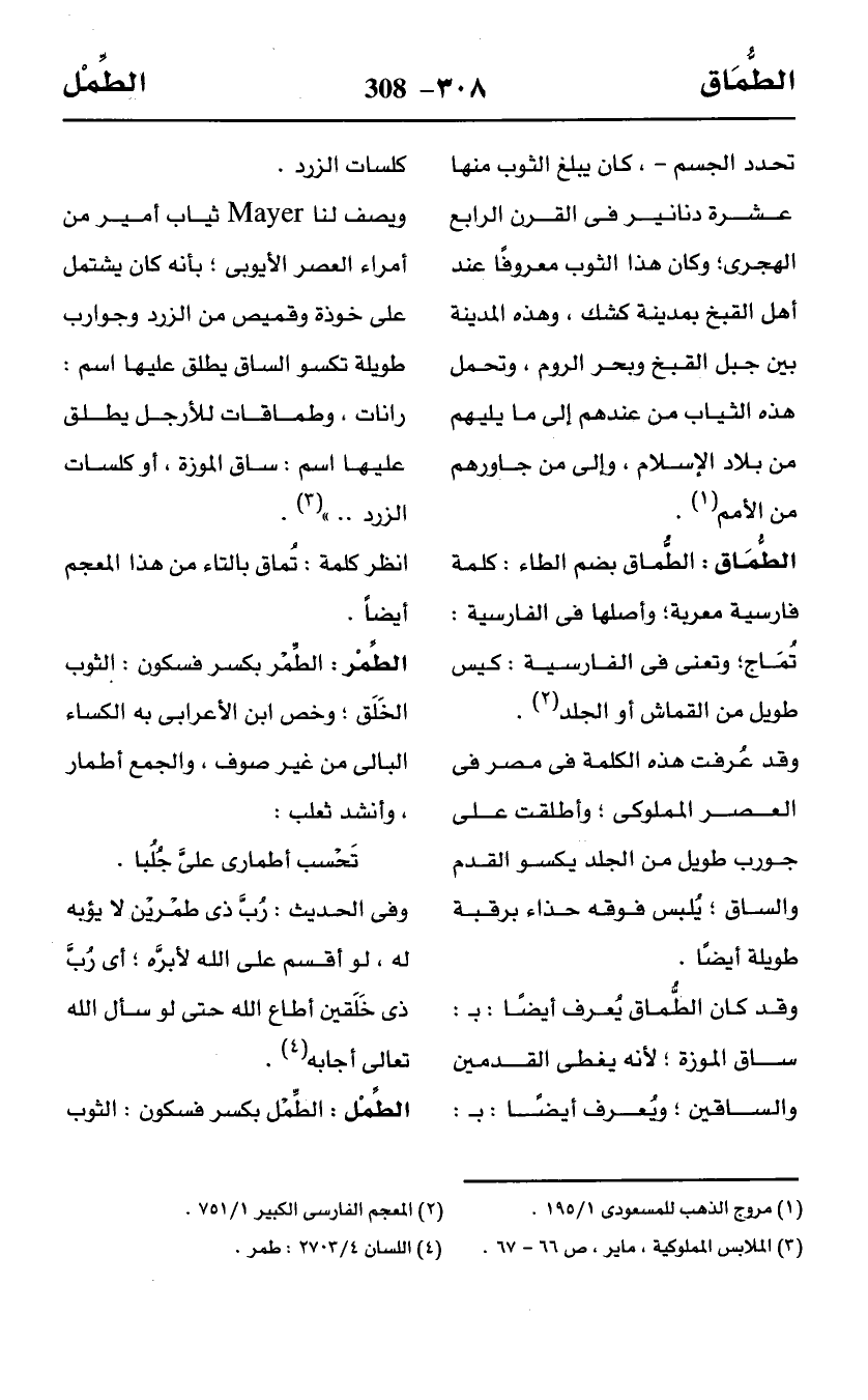 الطُّمَاق: الطُّماق بضم الطاء: كلمة فارسية معربة؛ وأصلها في الفارسية: تُمَاج؛ وتعنى في الفارسية: كيس طويل من القماش أو الجلد (¬2).