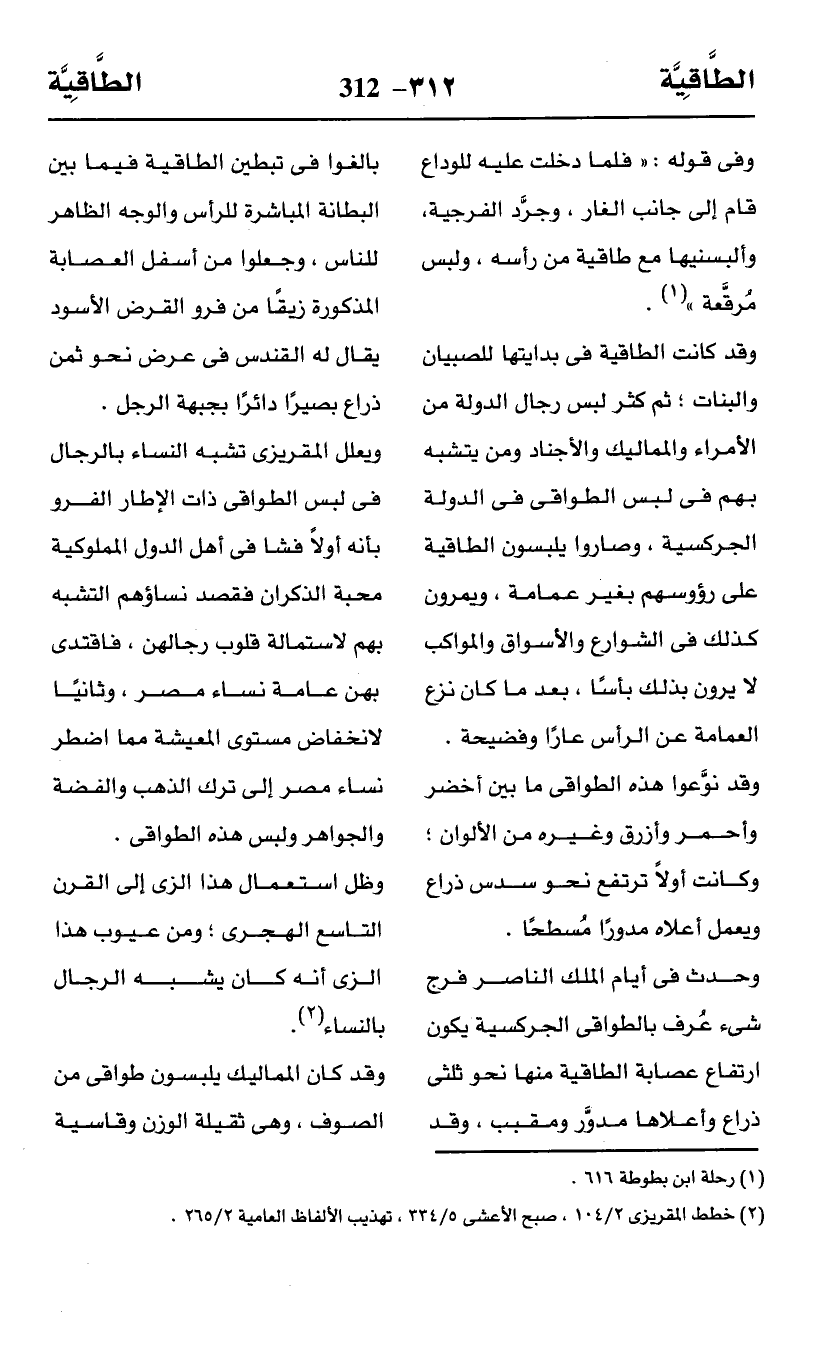 وقد كان المماليك يلبسون طواقى من الصوف، وهي ثقيلة الوزن وقاسية