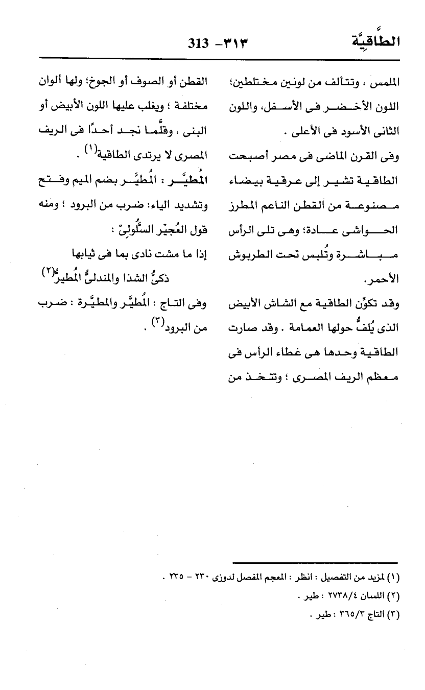 وقد تكوِّن الطاقية مع الشاش الأبيض الذي يلف حولها العمامة. وقد صارت الطاقية وحدها هي غطاء الرأس في معظم الريف المصري؛ وتتخذ من القطن أو الصوف أو الجوخ؛ ولها ألوان مختلفة؛ ويغلب عليها اللون الأبيض أو البنى، وقلَّما نجد أحدًا في الريف المصري لا يرتدى الطاقية (¬1).