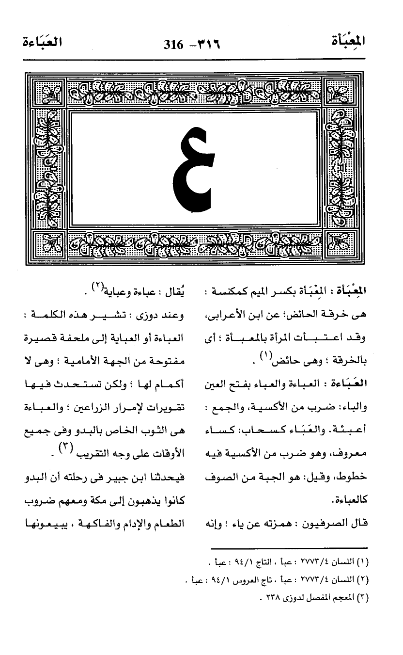وعند دوزى: تشير هذه الكلمة: العباءة أو العباية إلى ملحفة قصيرة مفتوحة من الجهة الأمامية؛ وهي لا أكمام لها؛ ولكن تستحدث فيها تقويرات لإمرار الزراعين؛ والعباءة هي الثوب الخاص بالبدو وفي جميع الأوقات على وجه التقريب (¬3).