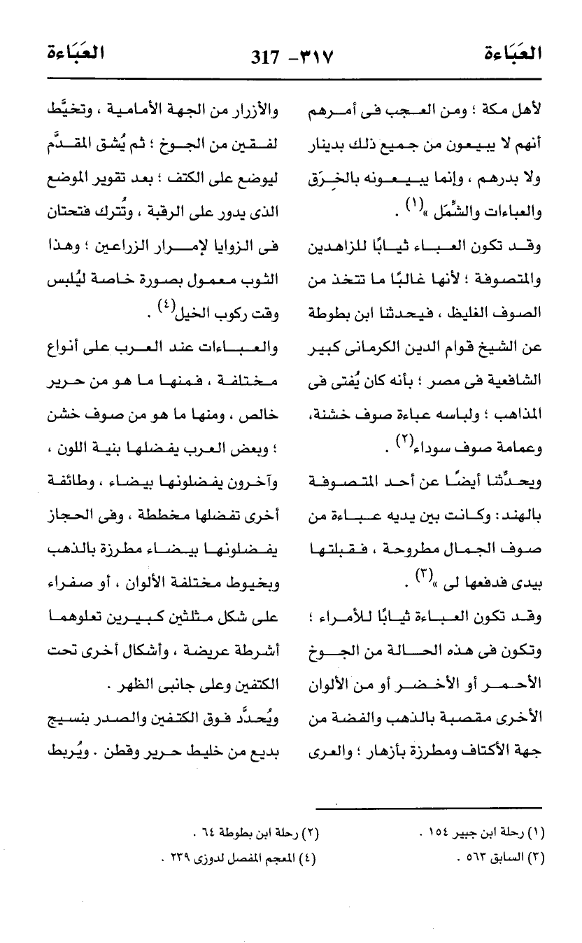 وقد تكون العباء ثيابًا للزاهدين والمتصوفة؛ لأنها غالبًا ما تتخذ من المتصوف الغليظ، فيحدثنا ابن بطوطة عن الشيخ قوام الدين الكرمانى كبير الشافعية في مصر؛ بأنه كان يُفتى في المذاهب؛ ولباسه عباءة صوف خشنة، وعمامة صوف سوداء (¬2).