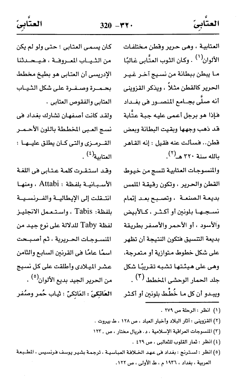 العتابية، وهي حرير وقطن مختلفات الألوان (¬1). وكان الثوب العتَّابى غالبًا ما يبطن ببطانة من نسيج آخر غير الحرير كالقطن مثلًا، ويذكر القزوينى أنه صلَّى بجامع المنصور في بغداد فإذا هو برجل أعمى عليه جبة عتَّابة قد ذهب وجهها وبقيت البطانة وبعض قطن. . فسألت عنه فقيل: إنه القاهر باللَّه سنة 320 هـ (¬2).