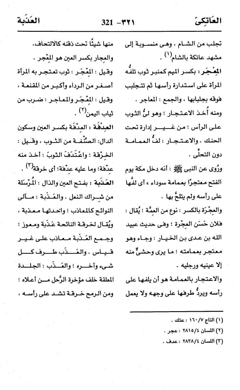ومنه أُخذ الاعتجار؛ وهو لىُّ الثوب على الرأس؛ من غير إدارة تحت الحنك. والاعتجار: لفُّ العمامة دون التحلِّى.