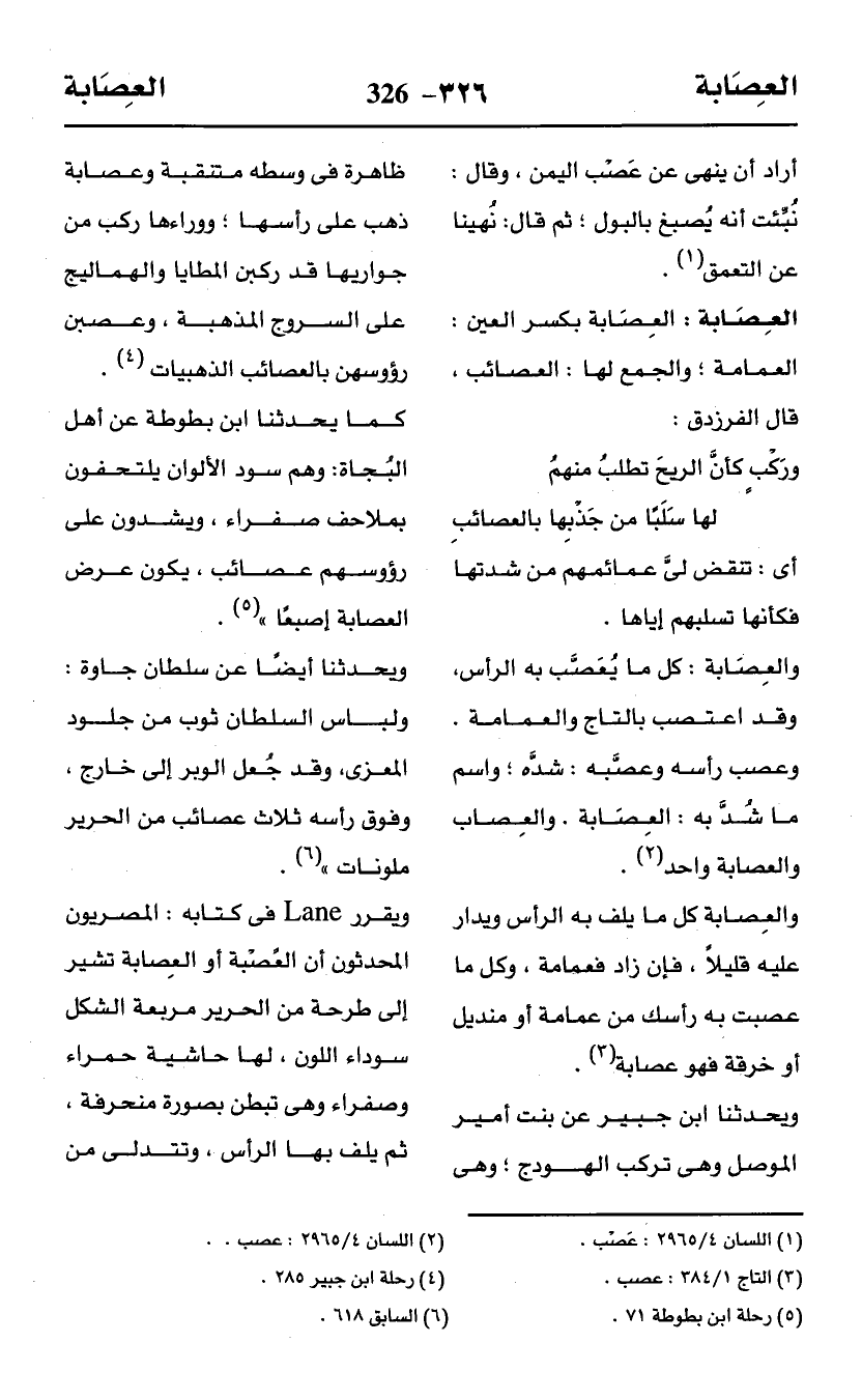 ويقرر Lane في كتابه: المصريون المحدثون أن العَصْبة أو العِصابة تشير إلى طرحة من الحرير مربعة الشكل سوداء اللون، لها حاشية حمراء وصفراء وهى تبطن بصورة منحرفة، ثم يلف بها الرأس، وتتدلى من