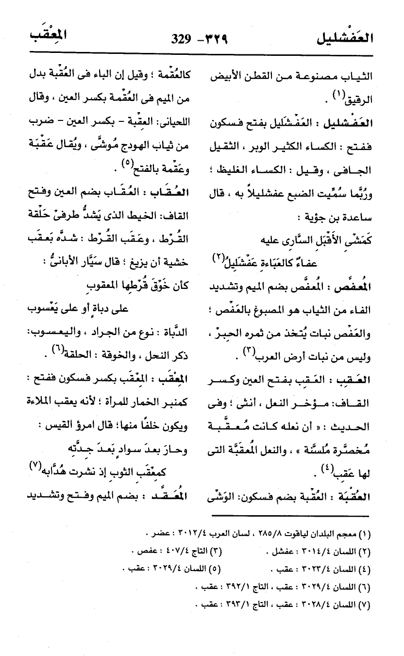 العَفْشليل: العَفْشَليل بفتح فسكون ففتح: الكساء الكثير الوبر، الثقيل الجافى، وقيل: الكساء الغليظ؛ ورُبَّما سُمِّيت الضبع عفشليلًا به، قال ساعدة بن جؤية: