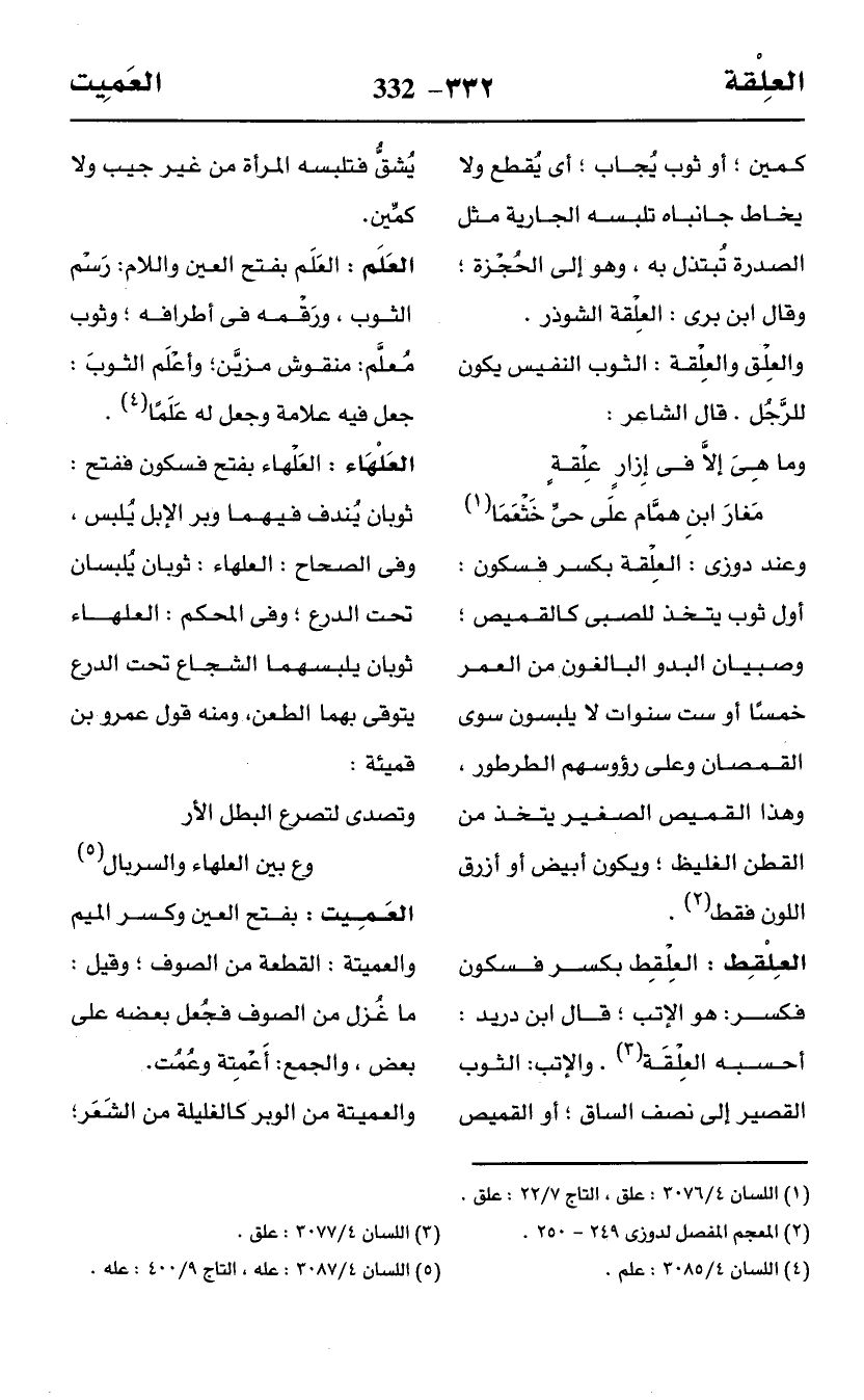 وعند دوزى: العِلْقة بكسر فسكون: أول ثوب يتخذ للصبى كالقميص؛ وصبيان البدو البالغون من العمر خمسًا أو ست سنوات لا يلبسون سوى القمصان وعلى رؤوسهم الطرطور، وهذا القميص الصغير يتخذ من القطن الغليظ؛ ويكون أبيض أو أزرق اللون فقط (¬2).
