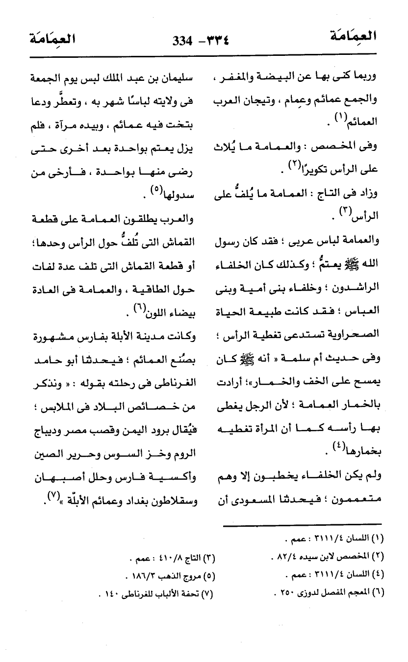 والعمامة لباس عربى؛ فقد كان رسول اللَّه -صلى اللَّه عليه وسلم- يعتمُّ؛ وكذلك كان الخلفاء الراشدون؛ وخلفاء بني أمية وبنى العباس؛ فقد كانت طبيعة الحياة الصحراوية تستدعى تغطية الرأس؛ وفي حديث أم سلمة "أنه -صلى اللَّه عليه وسلم- كان يمسح على الخف والخمار"؛ أرادت بالخمار العمامة؛ لأن الرجل يغطى بها رأسه كما أن المرأة تغطيه بخمارها (¬4).