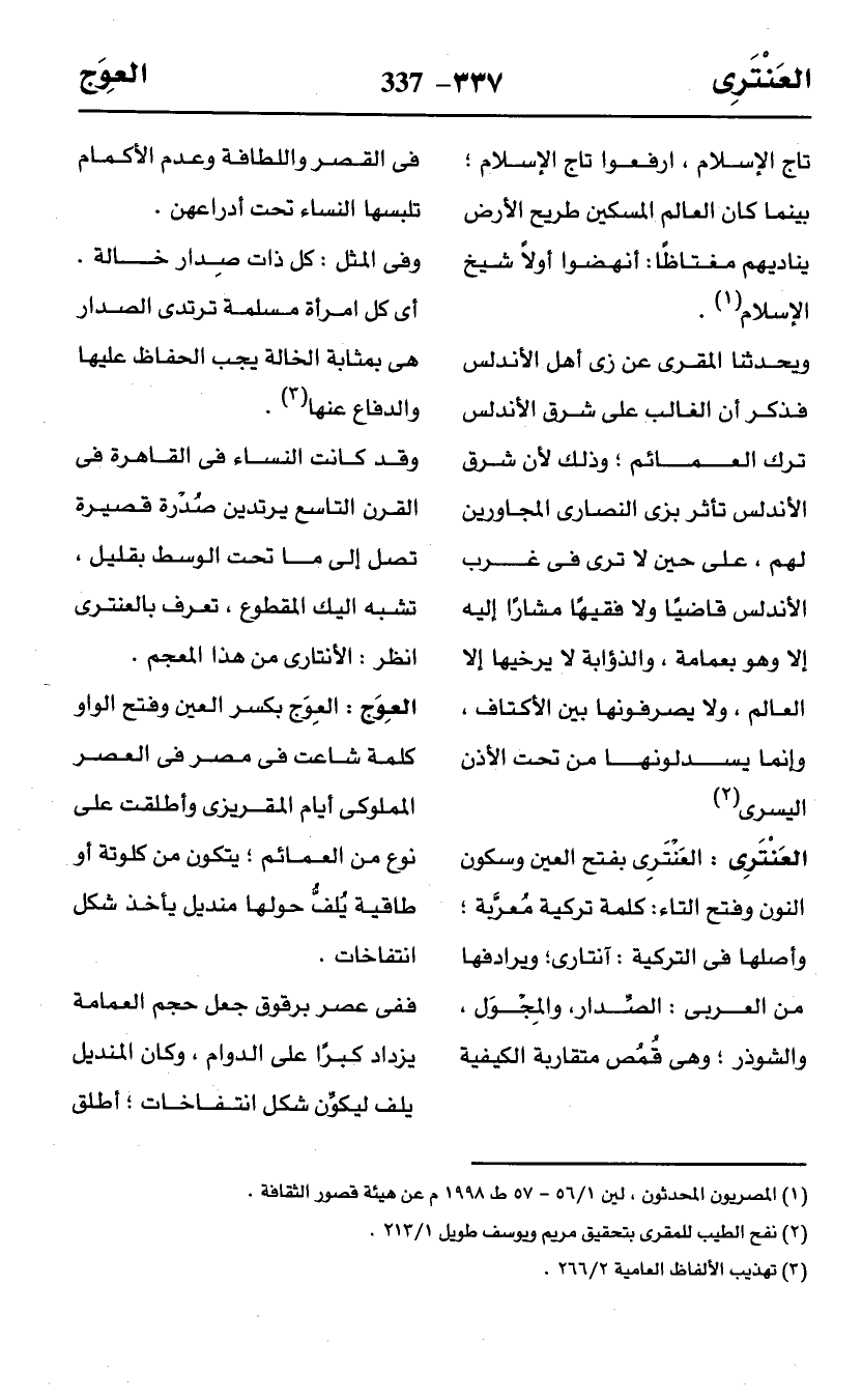العِوَج: العِوَج بكسر العين وفتح الواو كلمة شاعت في مصر في العصر المملوكي أيام المقريزى وأطلقت على نوع من العمائم؛ يتكون من كلوتة أو طاقية يُلفُّ حولها منديل يأخذ شكل انتفاخات.