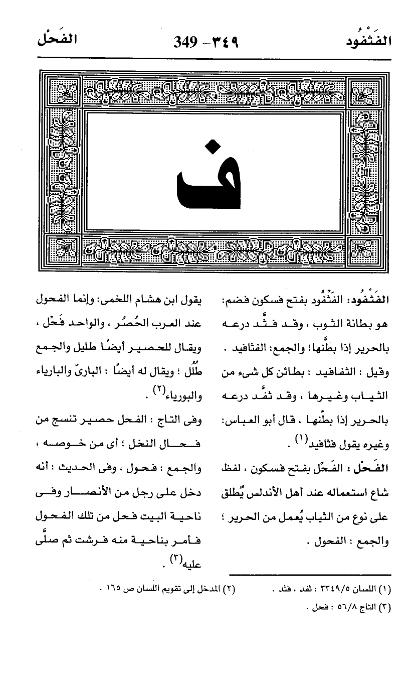 وفي التاج: الفعل حصير تنسج من فحال النخل؛ أي من خوصه، والجمع: فحول، وفي الحديث: أنه دخل على رجل من الأنصار وفى ناحية البيت فحل من تلك الفحول فأمر بناحية منه فرشت ثم صلَّى عليه (¬3).