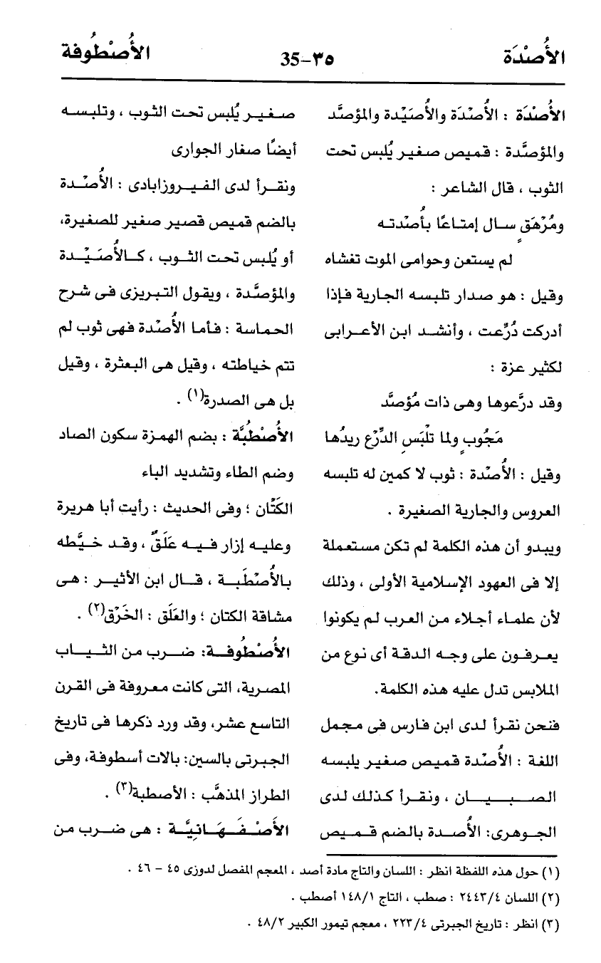 فنحن نقرأ لدى ابن فارس في مجمل اللغة: الأُصْدة قميص صغير يلبسه الصبيان، ونقرأ كذلك لدى الجوهرى: الأُصدة بالضم قميص صغير يُلبس تحت الثوب، وتلبسه أيضًا صغار الجوارى.