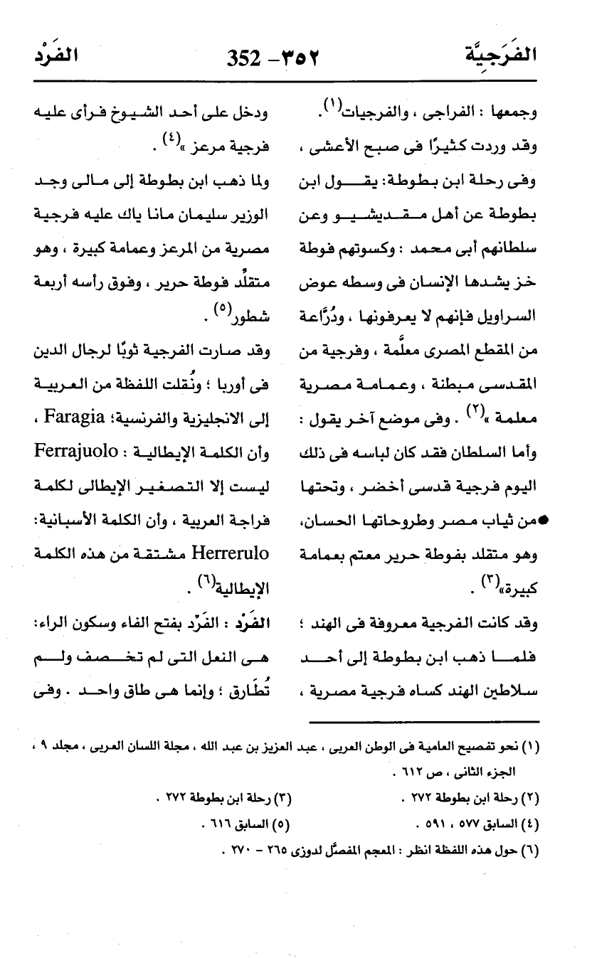 وقد وردت كثيرًا في صبح الأعشى، وفى رحلة ابن بطوطة: يقول ابن بطوطة عن أهل مقديشيو وعن سلطانهم أبي محمد: وكسوتهم فوطة خز يشدها الإنسان في وسطه عوض السراويل فإنهم لا يعرفونها، ودُرَّاعة من المقطع المصرى معلَّمة، وفرجية من المقدسى مبطنة، وعمامة مصرية معلمة" (¬2). وفى موضع آخر يقول: وأما السلطان فقد كان لباسه في ذلك اليوم فرجية قدسى أخضر، وتحتها من ثياب مصر وطروحاتها الحسان، وهو متقلد بفوطة حرير معتم بعمامة كبيرة" (¬3).