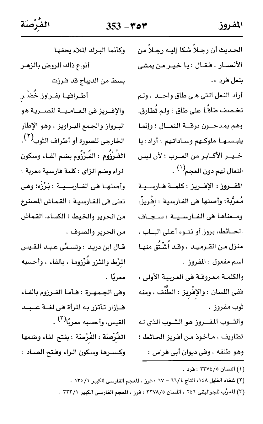 (¬2) شفاء الغليل 148، التاج 4/ 66 - 67: فرز، المعجم الفارسي الكبير 1/ 134.