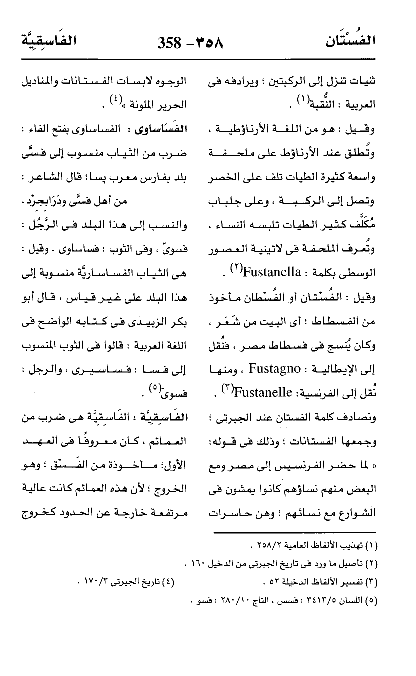 ونصادف كلمة الفستان عند الجبرتي؛ وجمعها الفستانات؛ وذلك في قوله: "لما حضر الفرنسيس إلى مصر ومع البعض منهم نساؤهم كانوا يمشون في الشوارع مع نسائهم؛ وهن حاسرات الوجوه لابسات الفستانات والمناديل الحرير الملونة" (¬4).