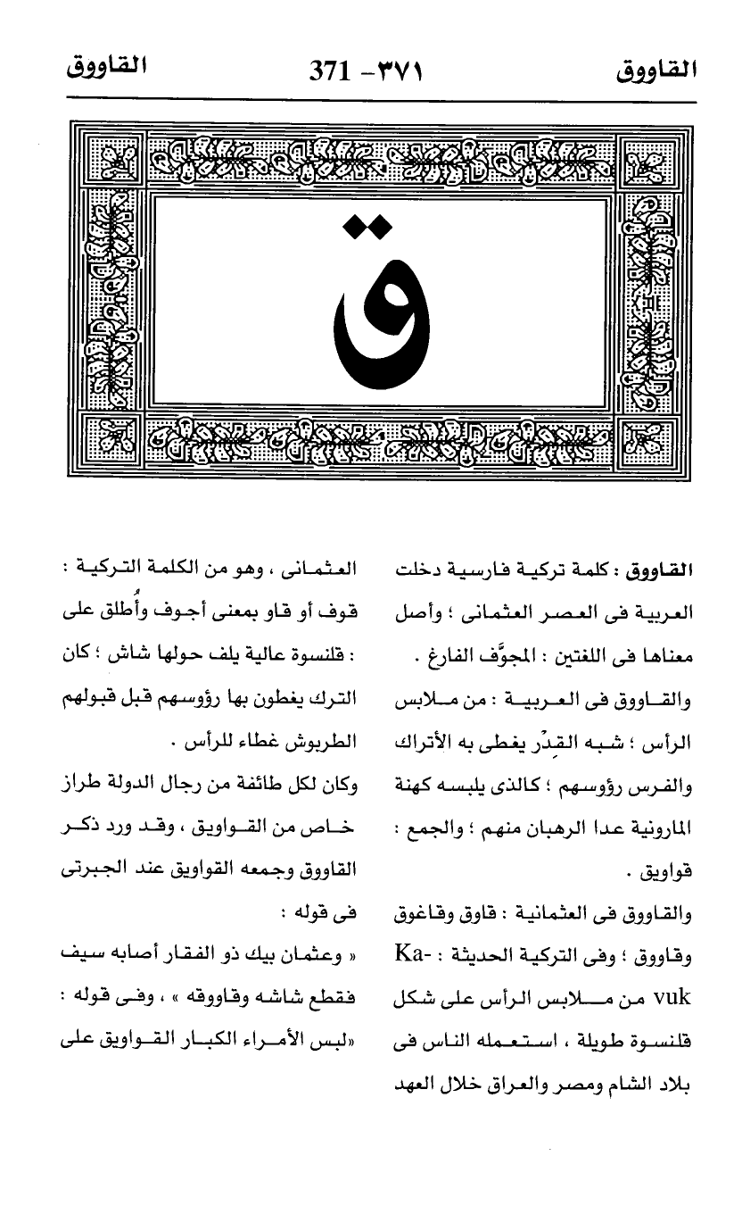 "وعثمان بيك ذو الفقار أصابه سيف فقطع شاشه وقاووقه"، وفى قوله: "لبس الأمراء الكبار القواويق على