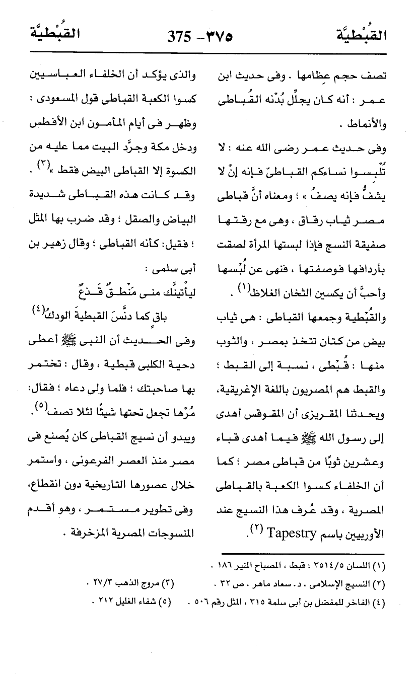 وفى الحديث أن النبي -صلى اللَّه عليه وسلم- أعطى دحية الكلبى قبطية، وقال: تختمر بها صاحبتك؛ فلما ولى دعاه؛ فقال: مُرْها تجعل تحتها شيئًا لئلا تصف (¬5). ويبدو أن نسيج القباطى كان يُصنع في مصر منذ العصر الفرعونى، واستمر خلال عصورها التاريخية دون انقطاع، وفى تطوير مستمر، وهو أقدم المنسوجات المصرية المزخرفة.