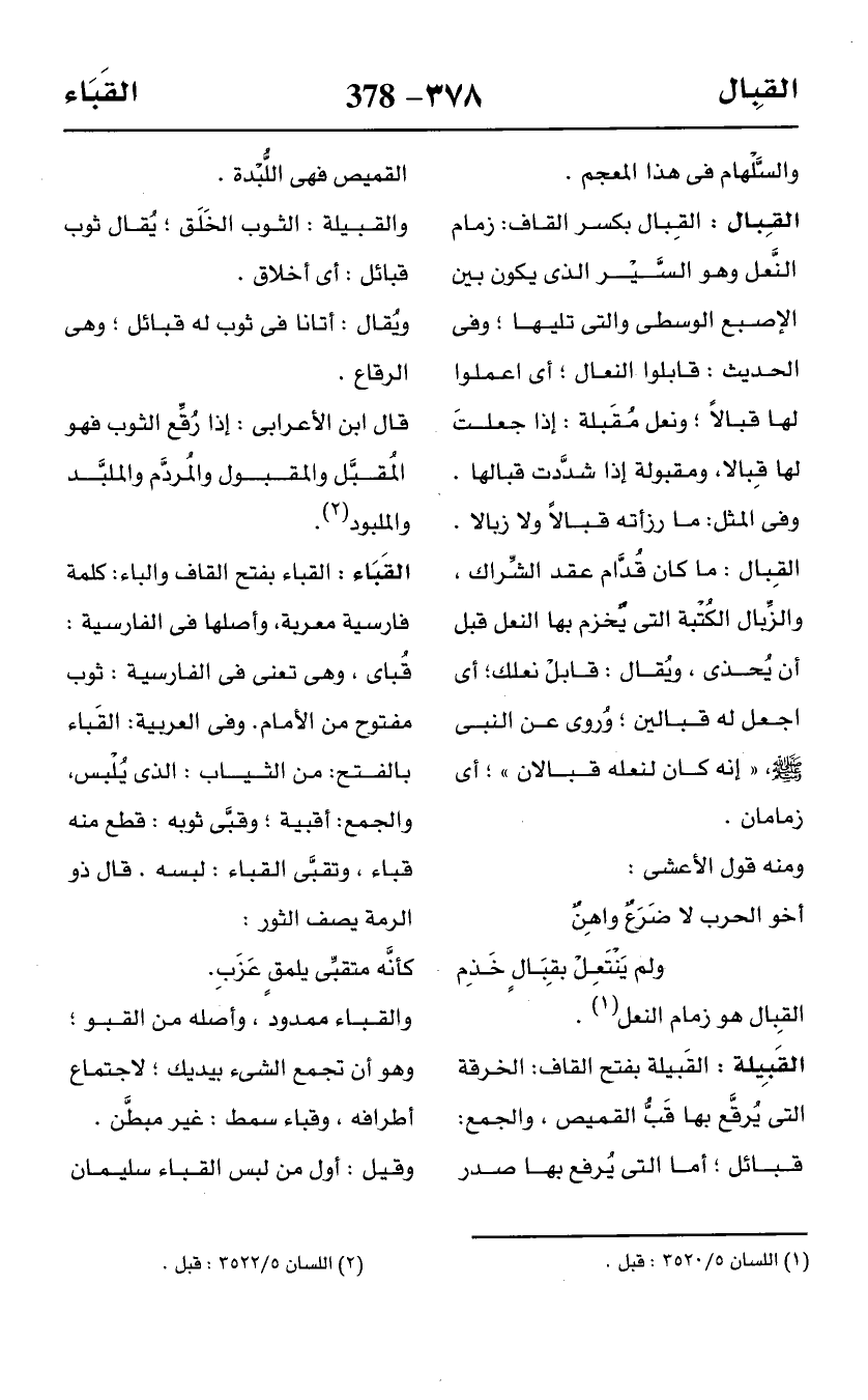 القِبال: القِبال بكسر القاف: زمام النَّعل وهو السَّيْر الذي يكون بين الإصبع الوسطى والتى تليها؛ وفى الحديث: قابلوا النعال؛ أى اعملوا لها قبالًا؛ ونعل مُقَبلة: إذا جعلتَ لها قِبالًا، ومقبولة إذا شدَّدت قبالها. وفى المثل: ما رزأته قبالًا ولا زبالا. القِبال: ما كان قُدَّام عقد الشِّراك، والزِّيال الكُتْبة التى يُخزم بها النعل قبل أن يُحذى، ويُقال: قابلْ نعلك؛ أى اجعل له قبالين؛ ورُوى عن النبي -صلى اللَّه عليه وسلم-، "إنه كان لنعله قبالان"؛ أى زمامان.