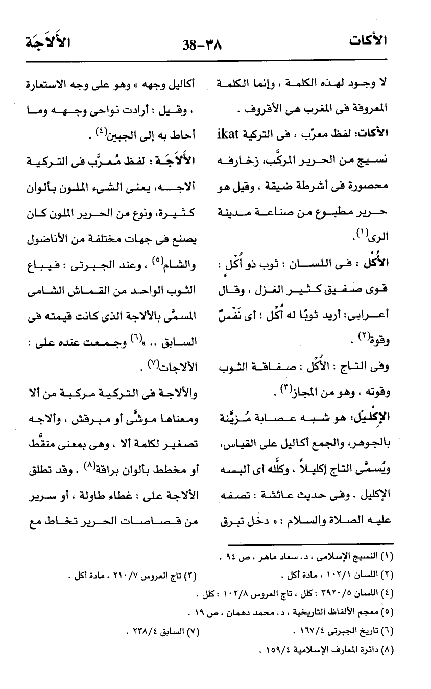 الأكات: لفظ معرّب، في التركية ikat نسيج من الحرير المركَّب، زخارفه محصورة في أشرطة ضيقة، وقيل هو حرير مطبوع من صناعة مدينة الرى (¬1).