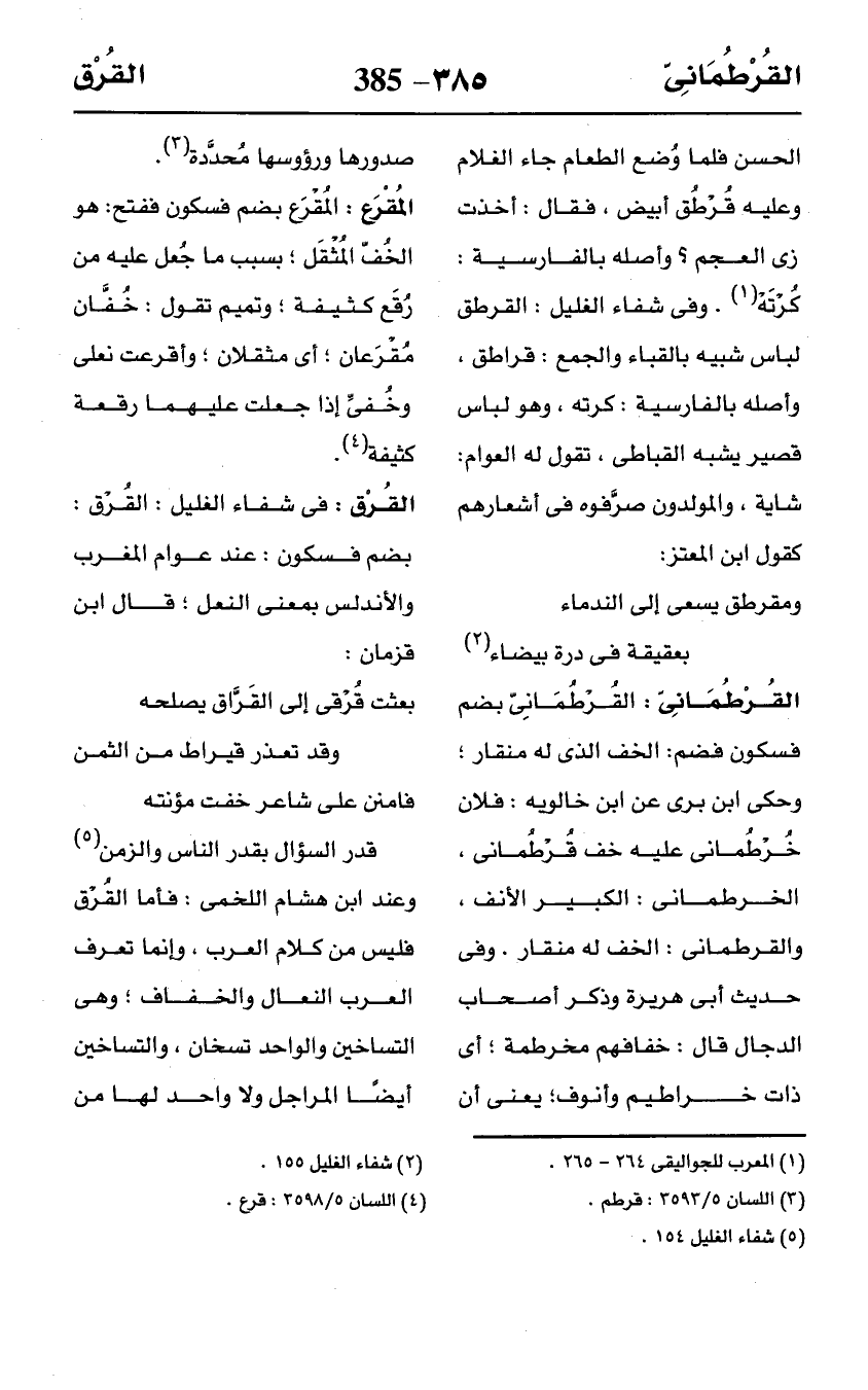 الحسن فلما وُضع الطعام جاء الغلام وعليه قُرْطُق أبيض، فقال: أخذت زى العجم؟ وأصله بالفارسية: كُرْتَهْ (¬1). وفى شفاء الغليل: القرطق لباس شبيه بالقباء والجمع: قراطق، وأصله بالفارسية: كرته، وهو لباس قصير يشبه القباطى، تقول له العوام: شاية، والمولدون صرَّفوه في أشعارهم كقول ابن المعتز: