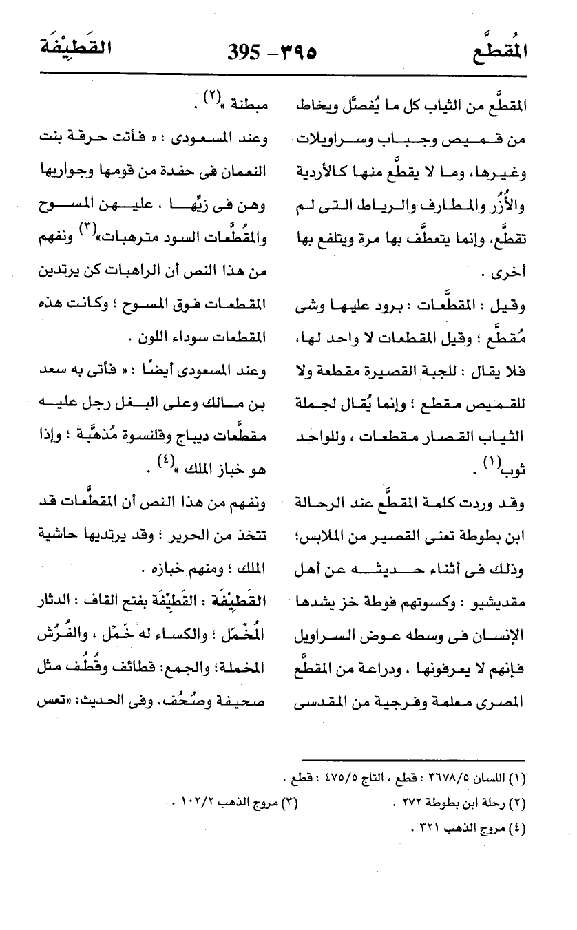 وقد وردت كلمة المقطَّع عند الرحالة ابن بطوطة تعني القصير من الملابس؛ وذلك في أثناء حديثه عن أهل مقديشيو: وكسوتهم فوطة حر يشدها الإنسان في وسطه عوض السراويل فإنهم لا يعرفونها، ودراعة من المقطَّع المصري معلمة وفرجية من المقدسى مبطنة" (¬2).