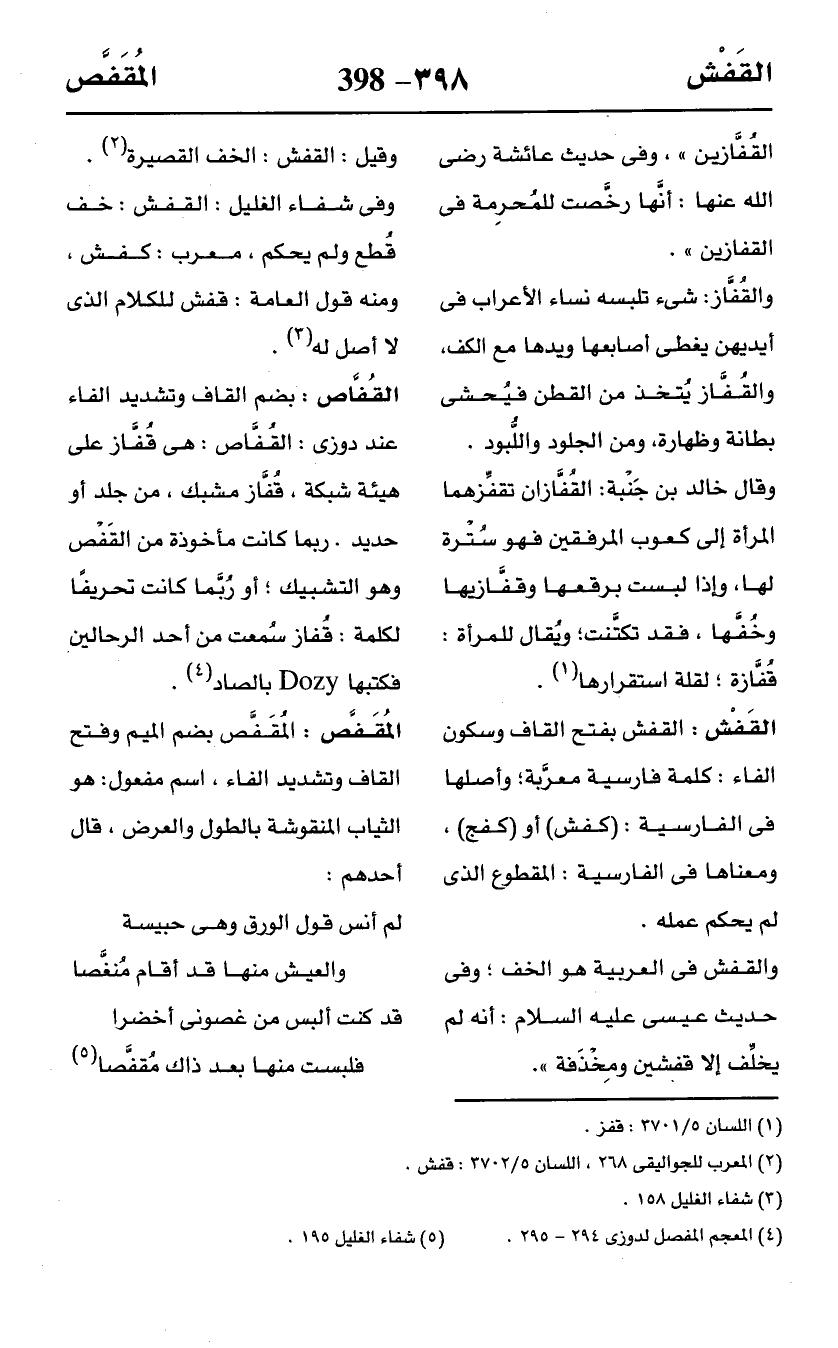 وفى شفاء الغليل: القفش: خف قُطع ولم يحكم، معرب: كفش، ومنه قول العامة: قفش للكلام الذي لا أصل له (¬3).