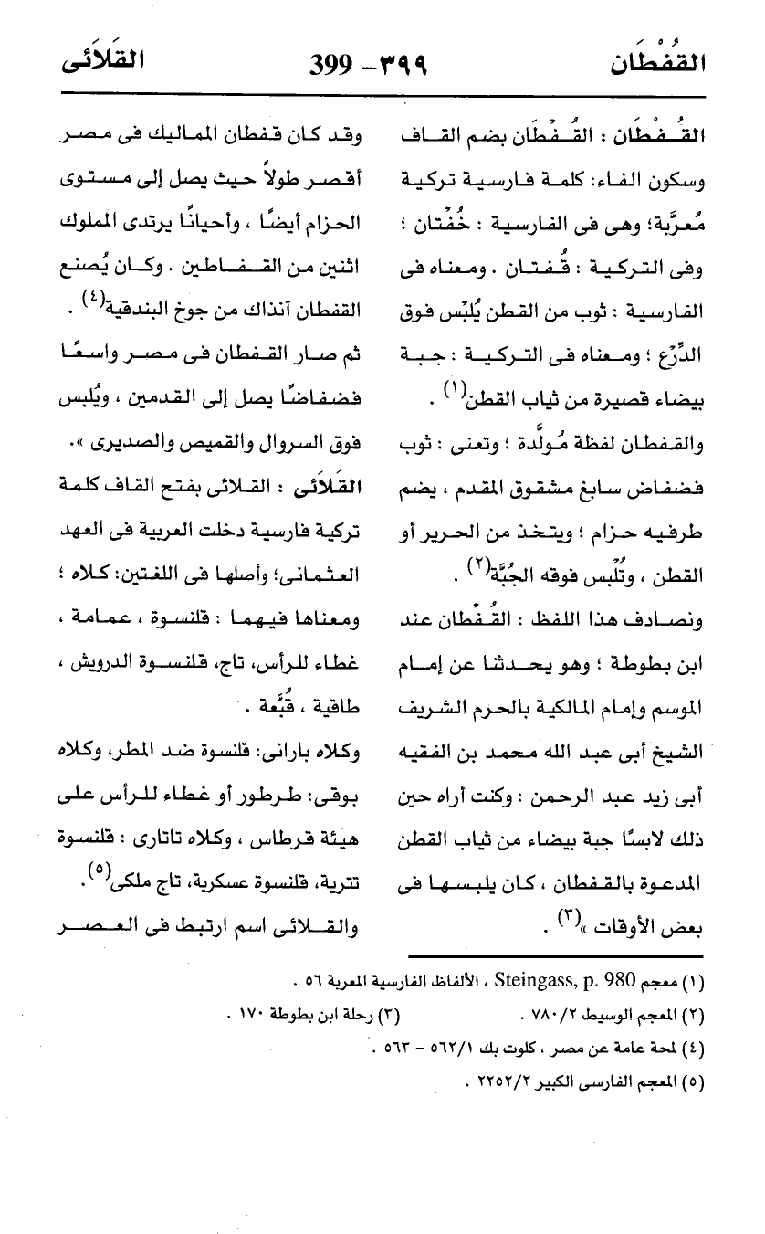 ونصادف هذا اللفظ: القُفْطان عند ابن بطوطة؛ وهو يحدثنا عن إمام الموسم وإمام المالكية بالحرم الشريف الشيخ أبي عبد اللَّه محمد بن الفقيه أبي زيد عبد الرحمن: وكانت أراه حين ذلك لابسًا جبة بيضاء من ثياب القطن المدعوة بالقفطان، كان يلبسها في بعض الأوقات" (¬3).