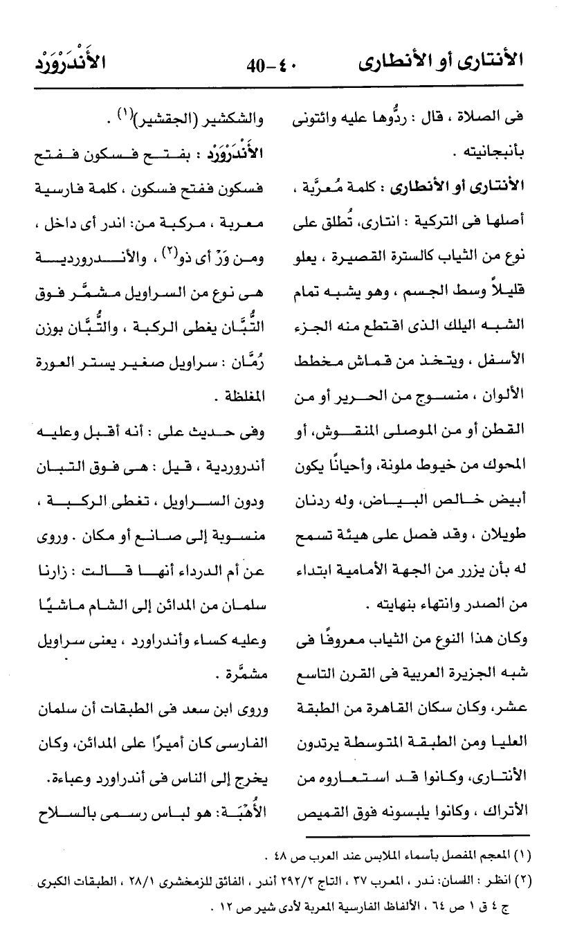 الأَنْدَرْوَرْد: بفتح فسكون ففتح فسكون ففتح فسكون، كلمة فارسية معرية، مركبة من: اندر أي داخل، ومن وَرْ أي ذو (¬2)، والأندروردية هي نوع من السراويل مشمَّر فوق التُّبَّان يغطى الركبة، والتُّبَّان بوزن رُمَّان: سراويل صغير يستر العورة المغلظة.