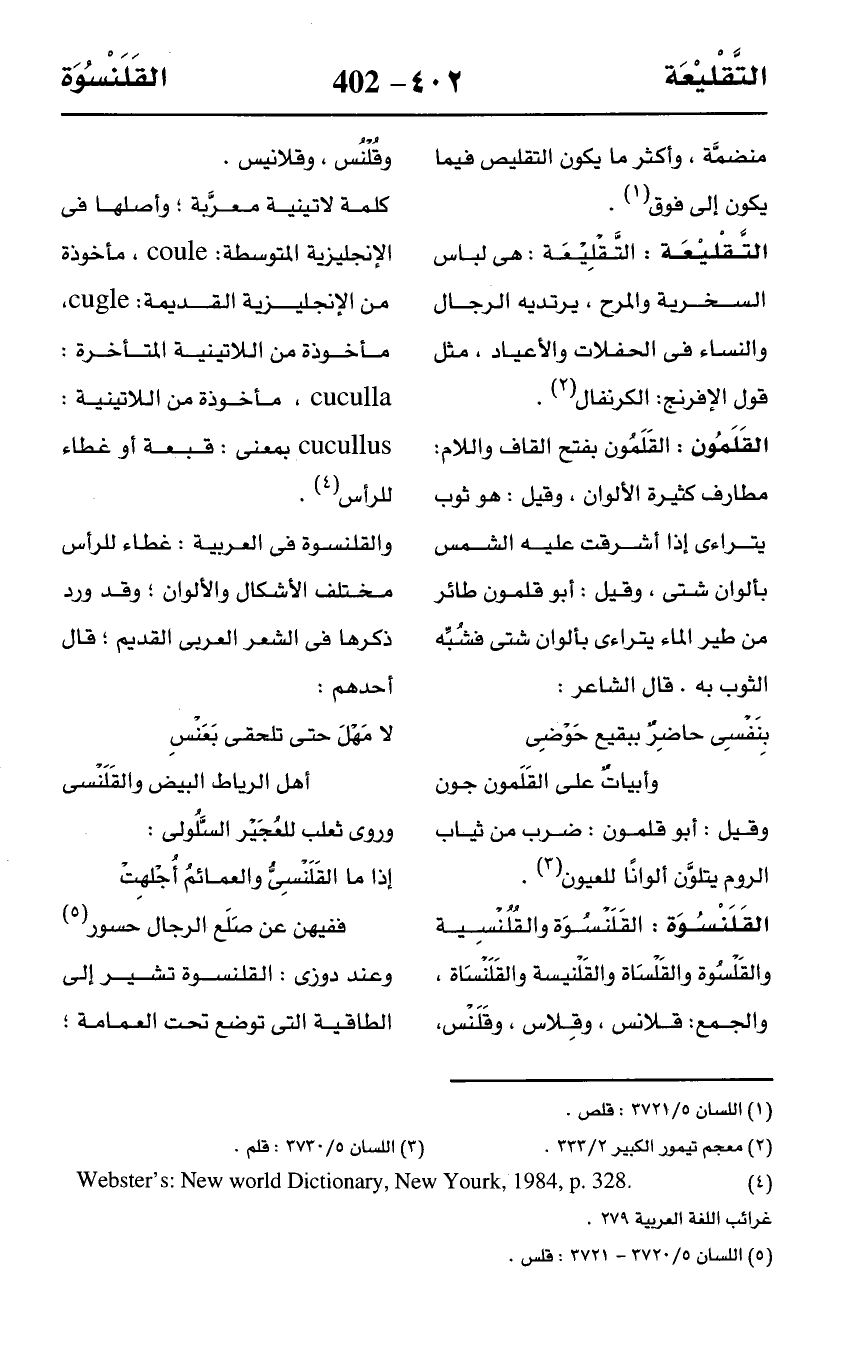 وعند دوزى: القلنسوة تشير إلى الطاقية التى توضع تحت العمامة؛