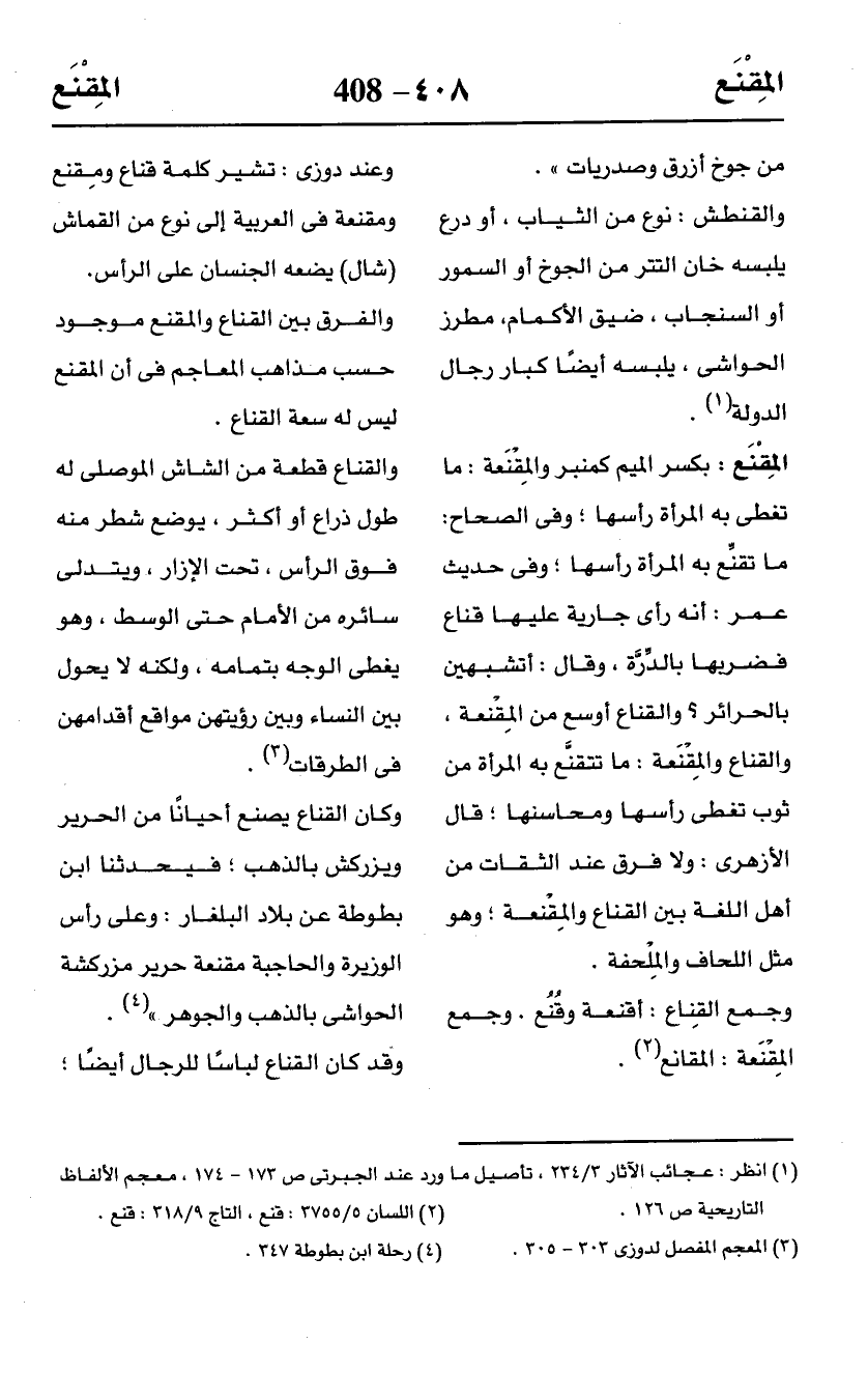 وعند دوزى: تشير كلمة قناع ومِقنع ومقنعة في العربية إلى نوع من القماش (شال) يضعه الجنسان على الرأس.