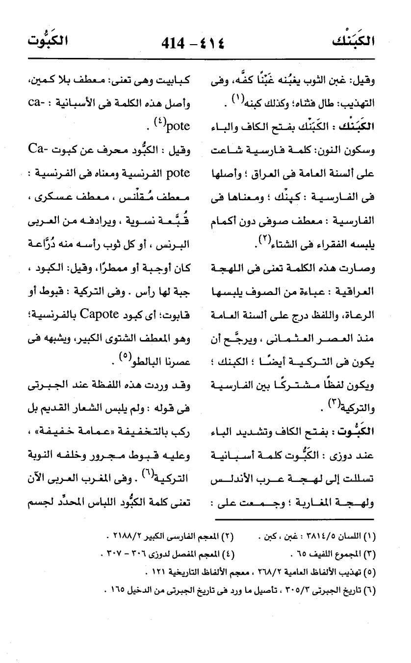 الكَبُّوت: بفتح الكاف وتشديد الباء عند دوزى: الكَبُّوت كلمة أسبانية تسللت إلى لهجة عرب الأندلس ولهجة المغاربة؛ وجمعت على: كبابيت وهى تعنى: معطف بلا كمين، وأصل هذه الكلمة في الأسبانية: Ca-pote (¬4) .