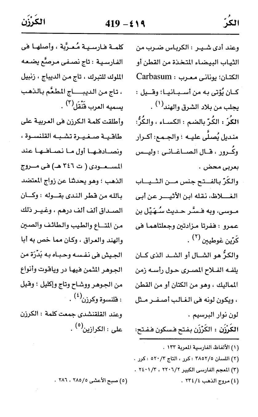 الكَرْزَن: الكَرْزَن بفتح فسكون ففتح: كلمة فارسية مُعرَّبة، وأصلها في الفارسية: تاج نصفى مرصَّع يضعه الملوك للتبرك، تاج من الديباج، زنبيل، تاج من الديباج المطعَّم بالذهب يسميه العرب قَنْقَل (¬3).