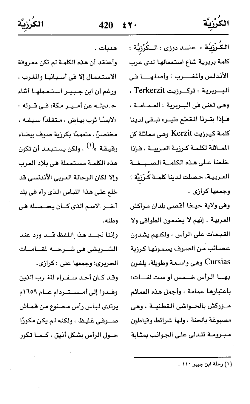 وأعتقد أن هذه الكلمة لم تكن معروفة الاستعمال إلا في أسبانيا والمغرب، ورغم أن ابن جبير استعملها أثناء حديثه عن أمير مكة؛ في قوله: "لابسًا ثوب بياض، متقلدًا سيفه، مختصرًا، متعممًا بكرزية صوف بيضاء رقيقة" (¬1). ولكن يستبعد أن تكون هذه الكلمة مستعملة في بلاد العرب وإلا لكان الرحالة العربى الأندلسى قد خلع على هذا اللباس الذى رآه في بلد آخر الاسم الذى كان يحمله في وطنه.