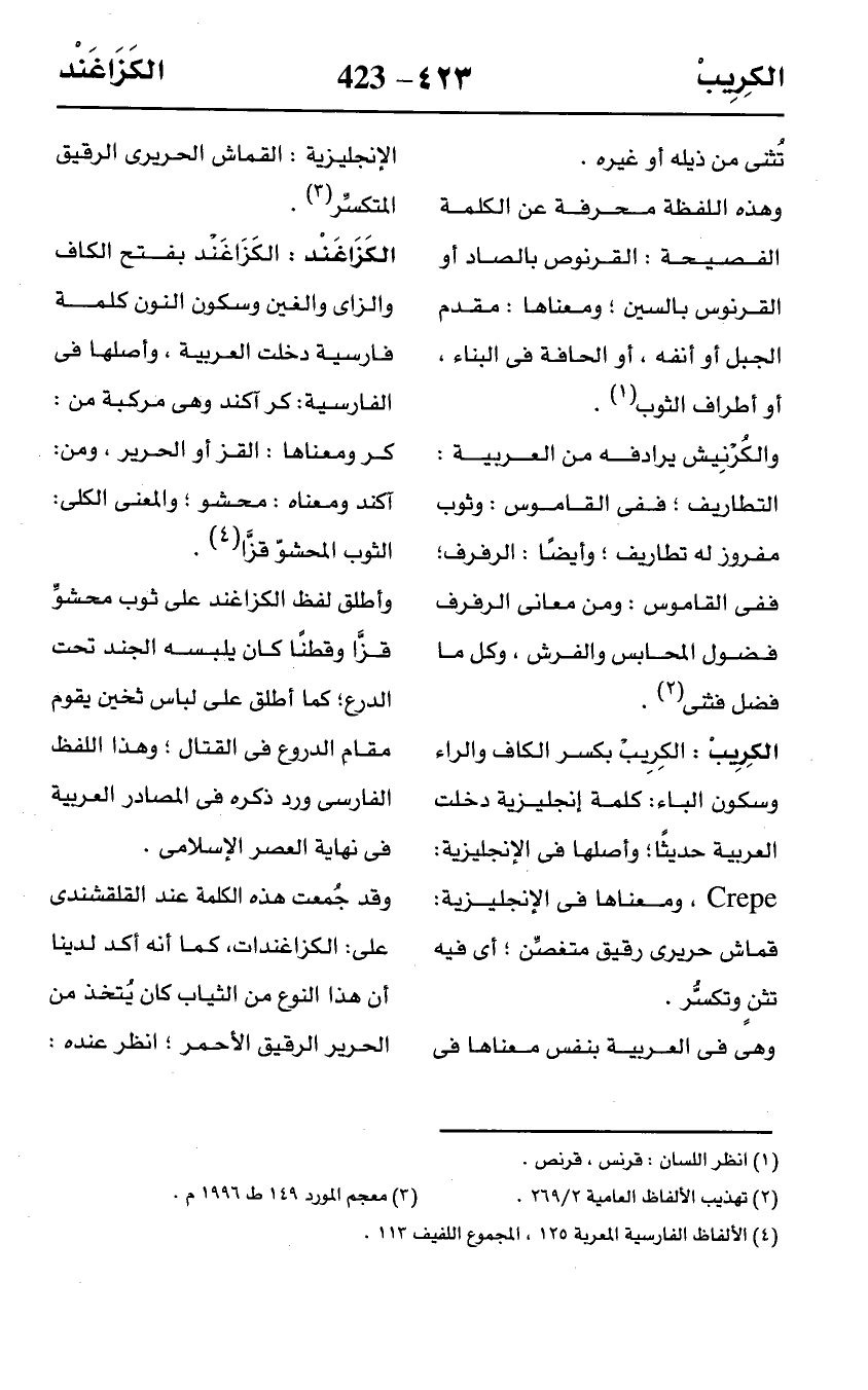 الكِرِيبْ: الكِرِيْب بكسر الكاف والراء وسكون الباء: كلمة إنجليزية دخلت العربية حديثًا؛ وأصلها في الإنجليزية: Crepe، ومعناها في الإنجليزية: قماش حريرى رقيق متغصِّن؛ أى فيه تثنٍ وتكسُّر.