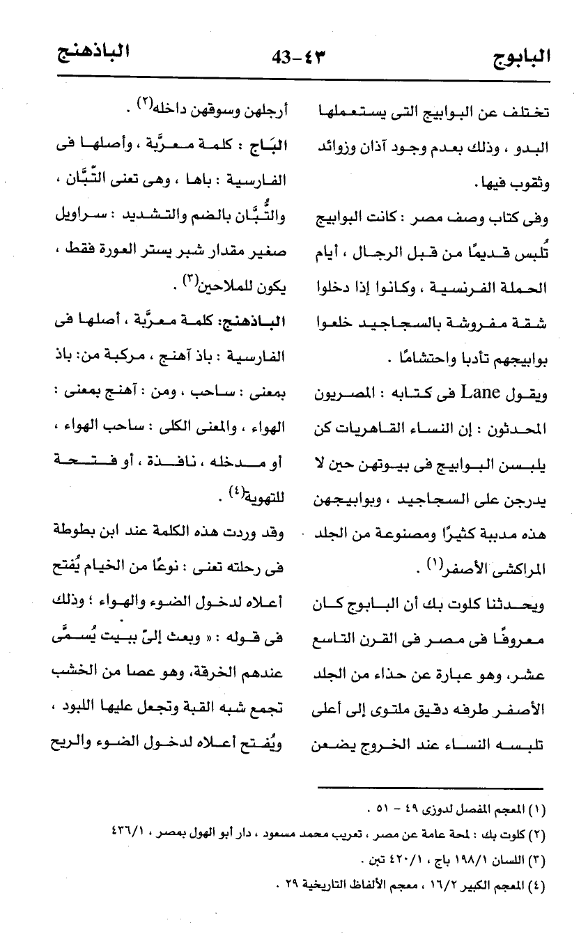 ويحدثنا كلوت بك أن البابوج كان معروفًا في مصر في القرن التاسع عشر، وهو عبارة عن حذاء من الجلد الأصفر طرفه دقيق ملتوى إلى أعلى تلبسه النساء عند الخروج يضعن أرجلهن وسوقهن داخله (¬2).