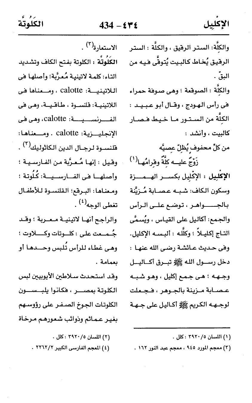 الكَلُوتَّة: الكلوتة بفتح الكاف وتشديد التاء: كلمة لاتينية مُعرَّبة؛ وأصلها في اللاتينية: calotte، ومعناها في اللاتينية: قلنسوة، طاقية، وهى في الفرنسية: calotte، وهى في الإنجليزية: calotte. ومعناها: قلنسوة لرجال الدين الكاثوليك (¬3).