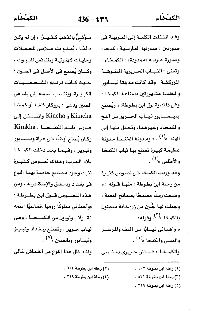 وقد انتقلت الكلمة إلى العربية في صورتين: صورتها الفارسية: كمخا؛ وصورة عربية "ممدودة": الكمخاء؛ وتعنى: الثياب الحريرية المنقوشة المزركشة؛ وقد كانت مدينتا نيسابور والخنسا مشهورتين بصناعة الكمخا؛ وفى ذلك يقول ابن بطوطة: "ويُصنع بنيسابور ثياب الحرير من النخ والكمخاء وغيرهما، وتحمل منها إلى الهند" (¬1)، "ومدينة الخنسا مدينة عظيمة كبيرة تصنع بها ثياب الكمخا والأطلس" (¬2).