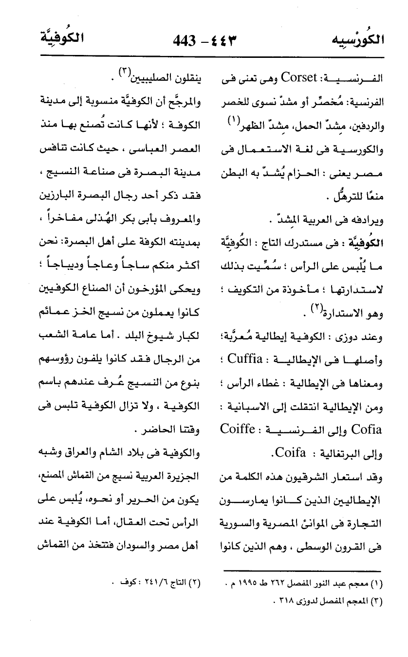 الكُوفِيَّة: في مستدرك التاج: الكُوفِيَّة ما يُلْبس على الرأس؛ سُمِّيت بذلك لاستدارتها؛ مأخوذة من التكويف؛ وهو الاستدارة (¬2).