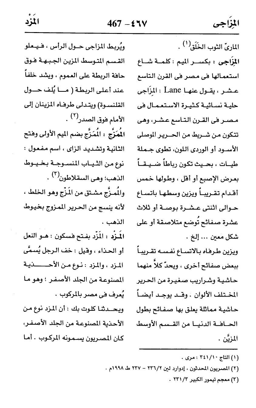 المِزَاجى: بكسر الميم: كلمة شاع استعمالها في مصر في القرن التاسع عشر، يقول عنها Lane: المِزَاجى حلية نسائية كثيرة الاستعمال في مصر في القرن التاسع عشر، وهي تتكون من شريط من الحرير الموصلى الأسود أو الوردى اللون، تطوى جملة طيات، بحيث تكون رباطًا ضيقًا بعرض الإصبع أو أقل، وطولها خمس أقدام تقريبًا ويزين وسطها باتساع حوالى اثنتى عشرة بوصة أو ثلاث عشرة صفائح تُوضع متلاصقة أو على شكل معين. . . إلخ.