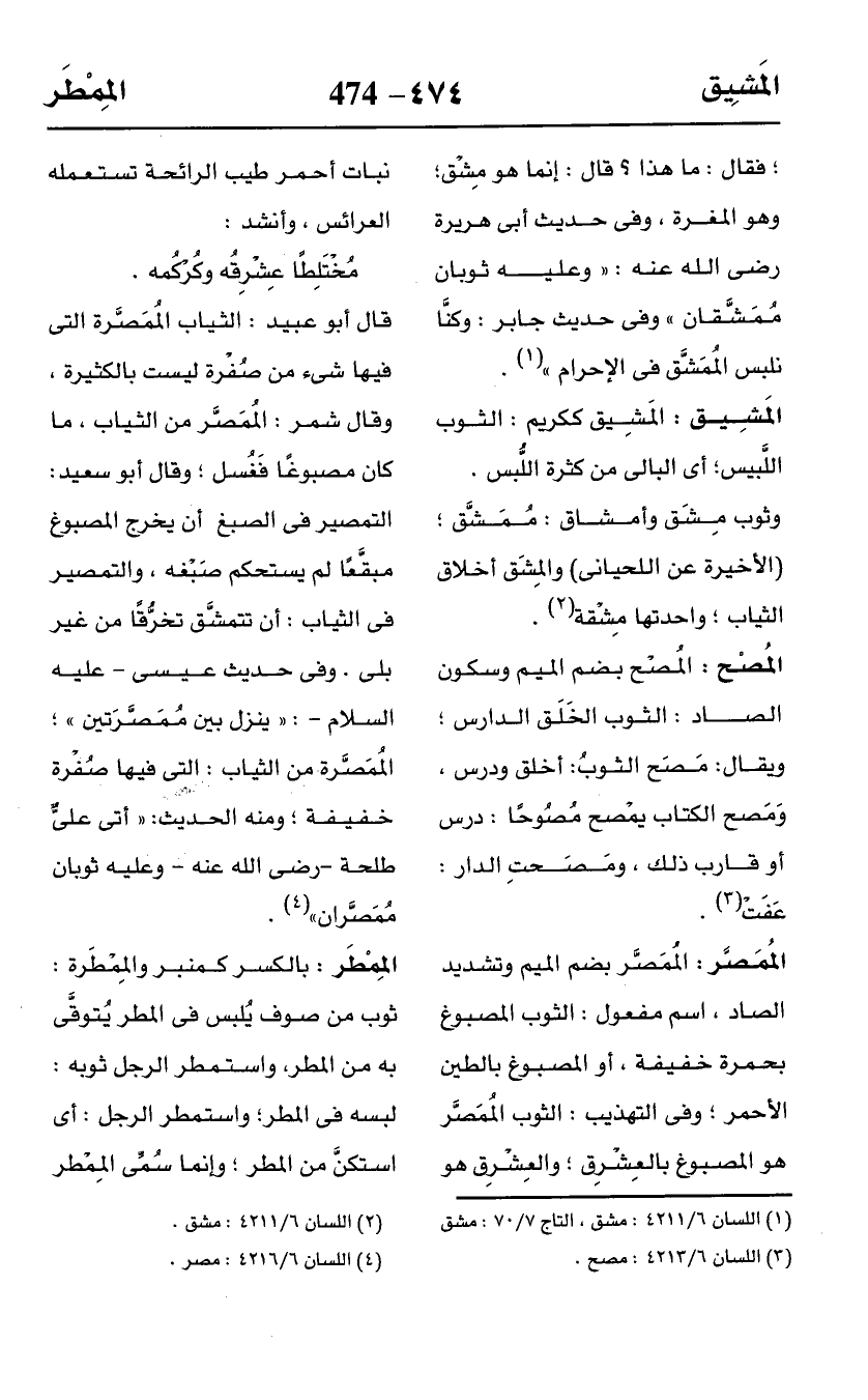 قال أبو عبيد: الثياب المُمَصَّرة التي فيها شئ من صُفْرة ليست بالكثيرة، وقال شمر: المُمَصَّر من الثياب، ما كان مصبوغًا فَغُسل: وقال أبو سعيد: التمصير في الصبغ أن يخرج المصبوغ مبقَّعًا لم يستحكم صَبْغه، والتمصير في الثياب: أن تتمشَّق تخرُّقًا من غير بلى. وفى حديث عيسى -عليه السلام-: "ينزل بين مُمَصَّرَتين"؛ المُمَصَّرة من الثياب: التى فيها صُفْرة خفيفة؛ ومنه الحديث: "أتى عليٌّ طلحة -رضي اللَّه عنه- وعليه ثوبان مُمَصَّران" (¬4).