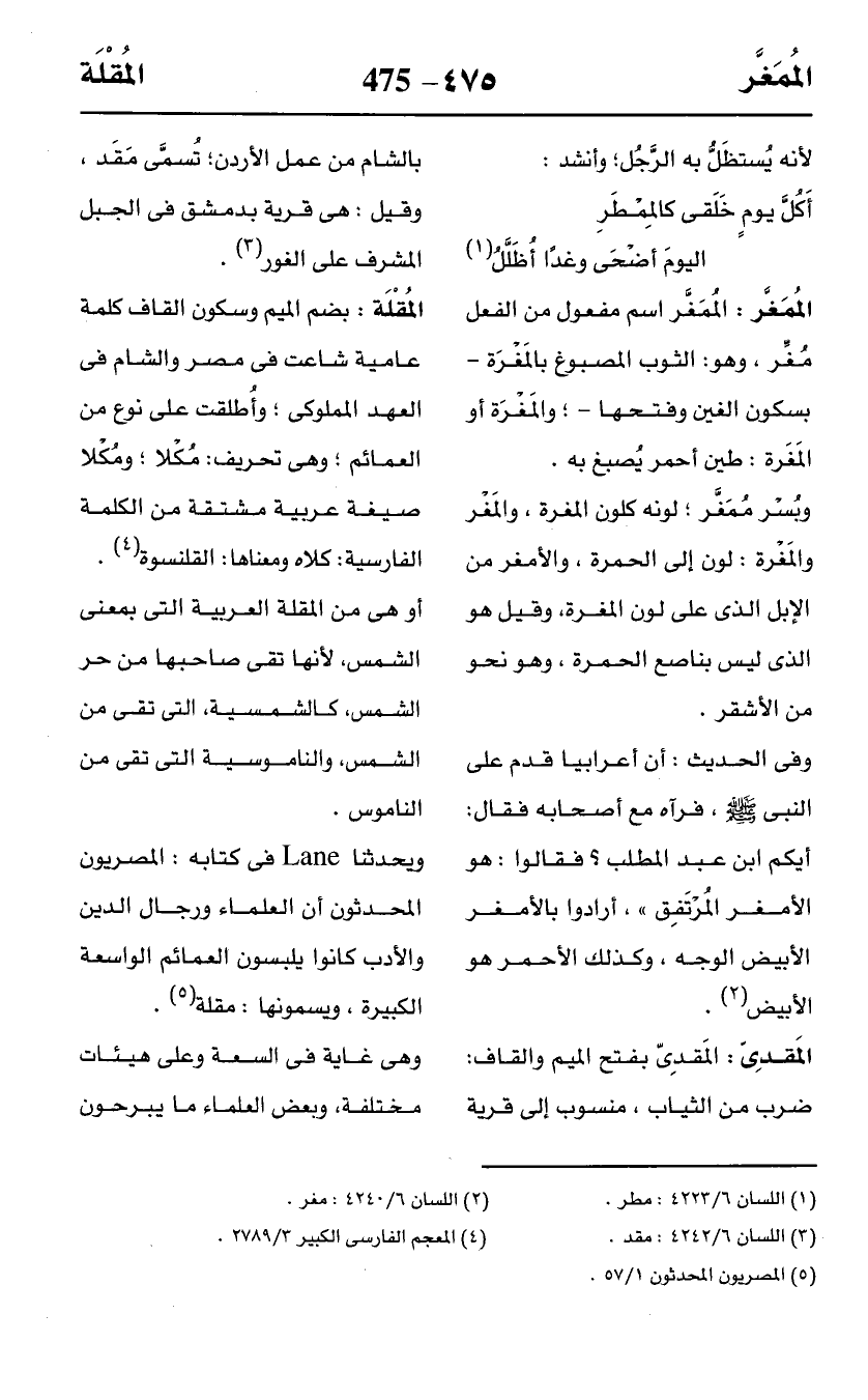 ويحدثنا Lane في كتابه: المصريون المحدثون أن العلماء ورجال الدين والأدب كانوا يلبسون العمائم الواسعة الكبيرة، ويسمونها: مقلة (¬5).