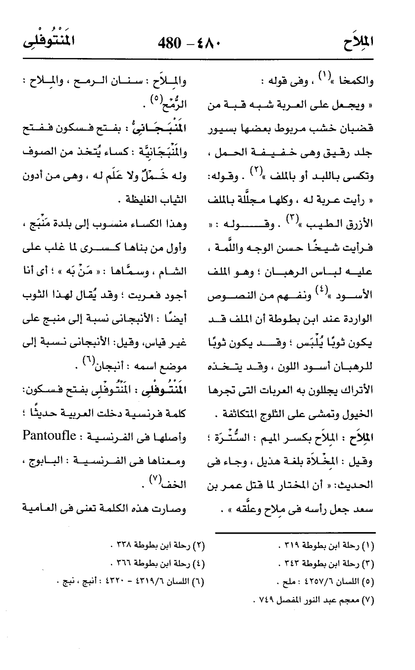 المَنْتُوفْلي: المَنْتُوفْلِى بفتح فسكون: كلمة فرنسية دخلت العربية حديثًا؛ وأصلها في الفرنسية: Pantoufle ومعناها في الفرنسية: البابوج، الخف (¬7).
