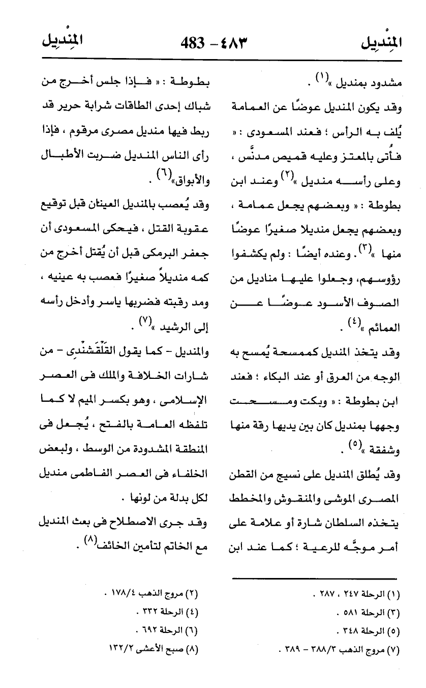 وقد يكون المنديل عوضًا عن العمامة يُلف به الرأس: فعند المسعودى: "فأُتى بالمعتز وعليه قميص مدنَّس، وعلى رأسه منديل" (¬2) وعند ابن بطوطة: "وبعضهم يجعل عمامة، وبعضهم يجعل منديلا صغيرًا عوضًا منها" (¬3). وعنده أيضًا: ولم يكشفوا رؤوسهم، وجعلوا عليها مناديل من الصوف الأسود عوضًا عن العمائم" (¬4).