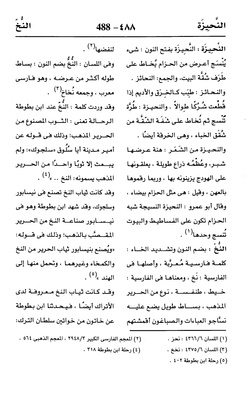 وقد وردت كلمة: النُّخّ عند ابن بطوطة الرحالة تعنى: الثوب المصنوع من الحرير المذهب. وذلك في قوله عن أمير مدينة أيا سُلُوق "سلجوك": ولم يبعث إلا ثوبًا واحدًا من الحرير المذهب يسمونه: النخ. . " (¬4).