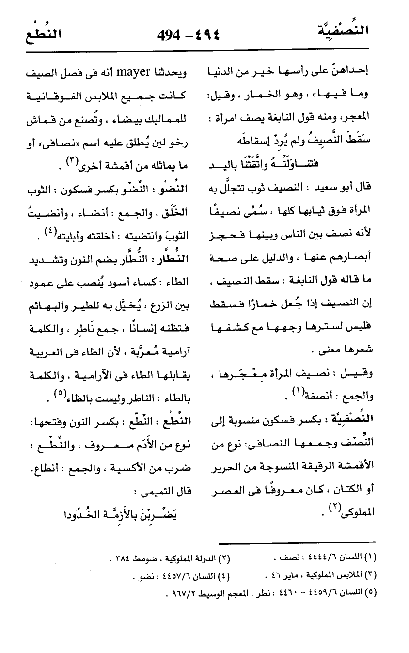 النِّصْفِيَّة: بكسر فسكون منسوبة إلى النِّصْف وجمعها النصافى: نوع من الأقمشة الرقيقة المنسوجة من الحرير أو الكتان، كان معروفًا في العصر المملوكى (¬2).