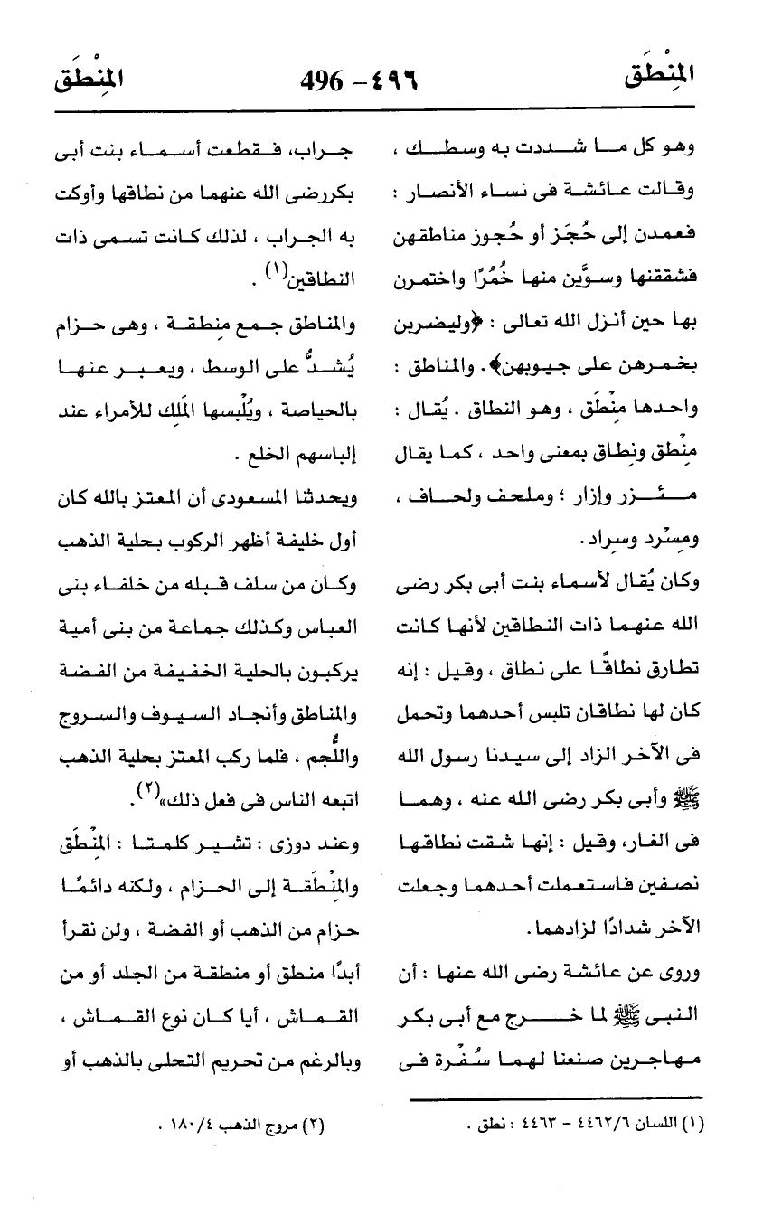 وعند دوزى: تشير كلمتما: المِنْطَق والمِنْطَقة إلى الحزام، ولكنه دائمًا حزام من الذهب أو الفضة، ولن نقرأ أبدًا منطق أو منطقة من الجلد أو من القماش، أيا كان نوع القماش، وبالرغم من تحريم التحلى بالذهب أو