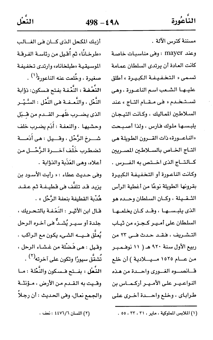 وعند mayer: وفى مناسبات خاصة كانت العادة أن يرتدى السلطان عمامة تسمى "التخفيفة الكبيرة" أطلق عليها الشعب اسم الناعورة، وهي تستخدم "في مقام التاج" عند السلاطين المماليك، وكانت التيجان يلبسها ملوك فارس، ولذا أصبحت "الناعورة" ذات القرون الطويلة هي التاج الخاص بالسلاطين المصريين كالتاج الذي اختص به الفرس. وكانت الناعورة أو التخفيفة الكبيرة بقرونها الطويلة نوعًا من أغطية الرأس الثقيلة، وكان السلطان وحده هو الذي يلبسها، وقد كان يخلعها السلطان على أمير كجزء من ثياب التشريف، فقد حدث في 23 من ربيع الأول سنة 920 هـ (11 نوفمبر من عام 1525 ميلادية) أن خلع قانصوه الغورى واحدة من هذه النواعير على الأمير أركماس بن طراباى، وخلع واحدة أخرى على أزبك المكحل الذي كان في الغالب "طرخانًا" ثم أُقيل من رئاسة الفرقة الموسيقية "طبلخاناه" وارتدى تخفيفة صفيرة، وخُلعت عنه الناعورة (¬1).
